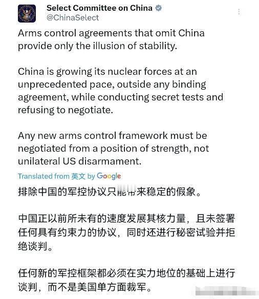 美国众议院中国问题委员会将矛头对准我们!2月7日,该委员会声称,将中国排除在外的军控协议,带来的不过是虚假的稳定。中国在不受“任何具约束力协议”约束的情况下,正以“前所未有”的速度扩充核力量,同时开展秘密试验、拒绝相关谈判。任何新的军控框架,都必须以实力为基础展开谈判,而非让美国单方面裁军。 美方这种论调压根站不住脚,完全是无视全球核力量格局的睁眼说瞎话。瑞典斯德哥尔摩国际和平研究所的数据已经明确,2025年俄罗斯拥有核弹头4309枚,美国则持有3700枚,两国合计占据全球核武器总量的九成以上。 中国的核力量规模始终维持在国家安全需要的最低水平,与美俄完全不在一个量级,这样的客观差距是国际社会有目共睹的事实。 美俄之间仅存的双边核军控条约《新削减战略武器条约》刚在2月5日正式到期,这个曾经维系全球战略稳定的重要协议,最终因为美方的消极态度走向失效。 特朗普政府时期就多次贬低该条约,甚至在条约即将到期时积极部署新型潜射低当量核武器,还强行要求第三方加入谈判制造障碍。 俄乌冲突爆发后,美国通过禁止俄飞机入境、拒发核查人员签证等手段,实质性剥夺了俄方的核查权利,直接导致条约核查机制陷入停滞。 俄方曾多次释放延长条约有效期的积极信号,却始终得不到美方回应,如今美方反倒将核军控体系失序的责任甩给中国,这种逻辑根本无法成立。 中国在核武器问题上的态度一直极其慎重负责。中国是唯一公开承诺不首先使用核武器的核国家,还无条件承诺不对无核武器国家和无核武器区使用或威胁使用核武器。 自1996年签署《全面禁止核试验条约》以来,中国始终恪守暂停核试验的承诺,更不存在美方所谓的“秘密试验”。外交部发言人早已明确表态,中国的核力量与美俄完全不在一个量级,现阶段要求中方加入核裁军谈判既不公平也不合理。 美方口中的“以实力为基础展开谈判”,本质上就是想让中国接受不对等的约束,从而锁住中国核力量的发展空间。 美国自己却在加速推进核武库现代化,不仅为新型“哨兵”洲际弹道导弹配备W87-1核弹头,还高调宣布打造“金穹”导弹防御系统,这些举动正在严重破坏全球战略平衡。 美国科学家联合会的数据显示,美国目前有约1770枚核弹头处于随时可发射的部署状态,另有1930枚作为储备,这样的核力量规模早已超出自身安全防卫需求。 国际社会普遍担心《新削减战略武器条约》失效会引发核军备竞赛,原子科学家公报甚至将“末日时钟”拨至距离午夜仅剩85秒的历史最危险位置。 作为拥有最大核武库的两个国家,美俄本应承担核裁军的特殊优先责任,进一步大幅度削减核武库,为多边核裁军进程创造条件。但美方却无视自身义务,反而将矛头对准核力量规模远小于自己的中国,这种做法完全违背了《不扩散核武器条约》的精神,也损害了全球核军控体系的根基。 中国始终主张推进核裁军必须遵循“维护全球战略稳定”和“各国安全不受减损”原则,也愿意在条件成熟时参与所有核国家共同参加的包容性对话。 但这并不意味着中国会接受美方单方面设定的不公平框架,更不会放弃自身的正当安全权益。美方所谓“中国不负责”的指责,恰恰是在转移国际社会对美俄核裁军义务的关注,掩盖自身破坏全球战略稳定的真实行为。 全球核安全的维护,不能依靠单方面的霸权逻辑,更不能通过牺牲他国安全来谋求自身绝对优势。 美俄两国拥有的核武器数量足以毁灭世界多次,真正的核裁军应该从这两个国家开始,而不是要求核力量规模仅为其零头的中国进行“对等”裁减。美方众议院中国问题委员会的这番言论,不仅违背基本事实,还会加剧核军备竞赛的风险,给全球安全稳定带来更多不确定性。 中国始终坚持自卫防御的核战略,从不与任何国家进行军备竞赛,核力量的发展完全是为了慑止他国对中国使用或威胁使用核武器。 国际社会应该看清美方言论的虚伪性,敦促美俄两国切实履行核裁军义务,早日恢复战略稳定对话。只有所有核国家都秉持公平公正、合作共赢的态度,才能推动全球核军控进程稳步向前,为世界和平与安全筑牢防线。
