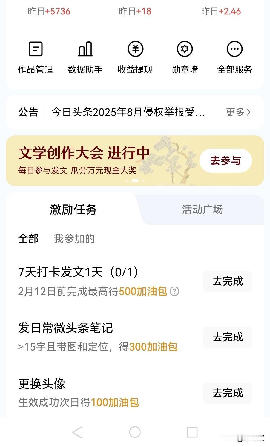 好不容易,有收益了,五千多的阅读量,收益(2.46)这个在头条是什么段位,垫底,为啥你们就能几十呢,是不是要每天互动,评论才收益高,每天也没有那那么多时间去,回访,找素材来源都已经累得慌了,不管他的了,争取过年能赚个100,就满足了,钱来,钱来