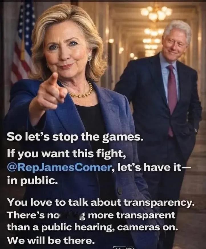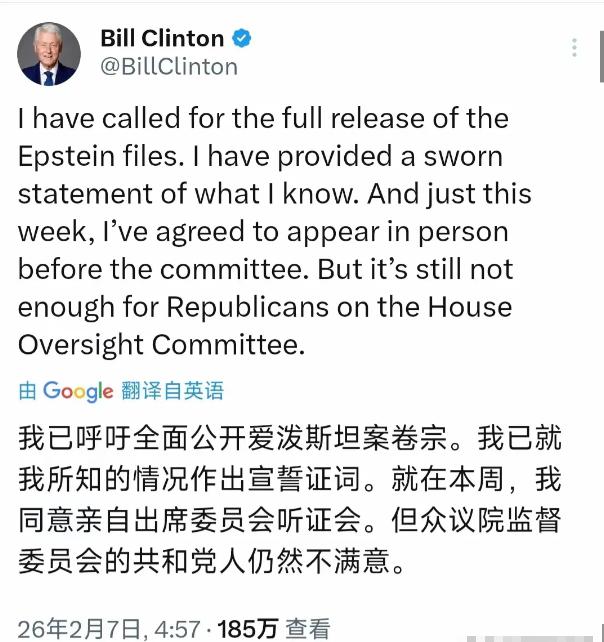 克林顿发长文,他和希拉里的反击开始了!   当地时间2月5日,希拉里率先发声,针对爱泼斯坦案的听证会选择闭门举行表达强烈不满,语气强硬,没有丝毫含糊;紧接着第二天,克林顿就发布了一篇长文,和希拉里遥相呼应,不仅同样质疑闭门会议的合理性,还直言这种安排根本不是为了追求真相,就是一场彻头彻尾的政治操弄。   夫妇俩一前一后、一唱一和,态度坚决,和之前面对调查时的隐忍克制判若两人,这份针锋相对的架势,瞬间引发了全美舆论的关注。   爱泼斯坦这个案子牵扯极广,牵扯到美国不少政商名流,2019年爱泼斯坦在狱中自杀后,这个案子就一直没有平息,联邦调查也一直在推进。   而共和党主导的众议院监督委员会,从2025年夏天就开始针对这个案子展开调查,并且一直把矛头对准克林顿夫妇,多次给他们发传票,要求他们就和爱泼斯坦的关系作证。   之前克林顿夫妇一直拒绝配合作证,声称这些传票是非法的,是共和党搞的政治攻击,双方拉扯了整整半年时间,共和党甚至威胁要以藐视国会的罪名起诉他们,还要追究罚款、监禁的责任。   直到2月2日,克林顿夫妇才松口,同意出面作证,本以为事情会就此缓和,没想到共和党却要求听证会闭门举行,只进行录像和文字记录,不向公众公开,这才有了夫妇俩接连发文不满的后续。   大家千万别以为,克林顿夫妇只是单纯不满听证会不公开,背后的核心,其实是对特朗普的反击,这其中的矛盾和反差,说出来让人唏嘘。   要知道,共和党一直揪着克林顿夫妇不放,频频针对他们展开调查,根本不是真的想查清爱泼斯坦案的真相,而是为了转移视线,帮特朗普脱责。   有公开信息显示,特朗普早年也和爱泼斯坦有过不少交往,相关文件中也多次提到两人的交集,但特朗普却一直矢口否认,还刻意和爱泼斯坦划清界限。   更让人不解的是,就在克林顿夫妇同意作证后,特朗普突然一改之前攻击克林顿夫妇的态度,公开表示遗憾,说讨厌有人这样针对克林顿,甚至夸赞希拉里聪明,这种前后不一的表态,明摆着就是想坐收渔利,看着克林顿夫妇被共和党牵制,自己则置身事外。   克林顿夫妇显然也看透了这一点,所以才会借闭门听证会这件事发难。他们要求听证会公开,就是想把所有事情都摆到阳光下,让公众看看共和党到底在耍什么花招,看看特朗普的虚伪面目。   一旦听证会公开,不仅共和党针对他们的政治操弄会暴露在公众面前,特朗普和爱泼斯坦的过往交集,也会被重新提及,到时候,特朗普再想置身事外,恐怕就没那么容易了。   从一开始的拒绝作证,到后来的松口妥协,再到如今的主动反击,克林顿夫妇的态度转变,背后全是政治博弈的痕迹。他们很清楚,一味隐忍只会任人摆布,只有主动出击,才能打破共和党和特朗普的算计。   目前,众议院监督委员会已经拒绝了克林顿夫妇要求公开听证会的请求,双方的僵持还在继续,但可以肯定的是,这场反击战,克林顿夫妇已经下定决心要打到底。   毕竟,克林顿夫妇现在是民主党的“自爆卡车”,就是要揭穿特朗普和共和党的双标行径,不让他们借着爱泼斯坦案的名义,继续搞政治操弄,好在中期选举中获得优势。   后续希拉里和克林顿将分别于2月26日、27日出面作证,这场闭门听证会到底会爆出哪些细节,克林顿夫妇的反击还会有哪些动作,我们会持续关注。