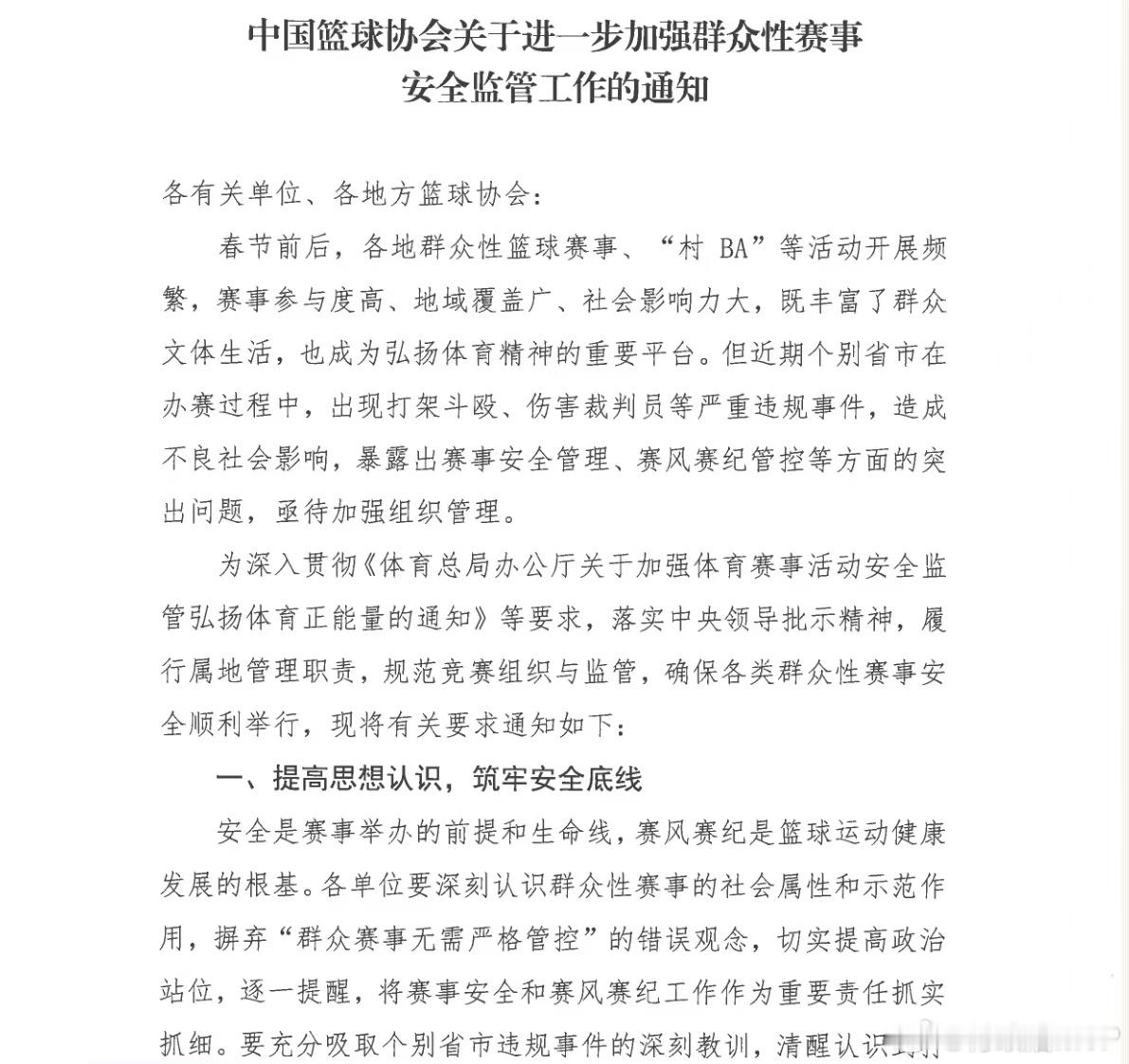 在耐高山东赛区群殴事件后,中国篮协印发《关于进一步加强群众性赛事安全监管工作的通知》。篮协将建立群众赛事违规违纪惩戒机制,若再发生打架斗殴、伤害裁判员等恶性事件,将对办赛单位和属地实行“一票否决”,一段时间内将不在当地安排篮球比赛。