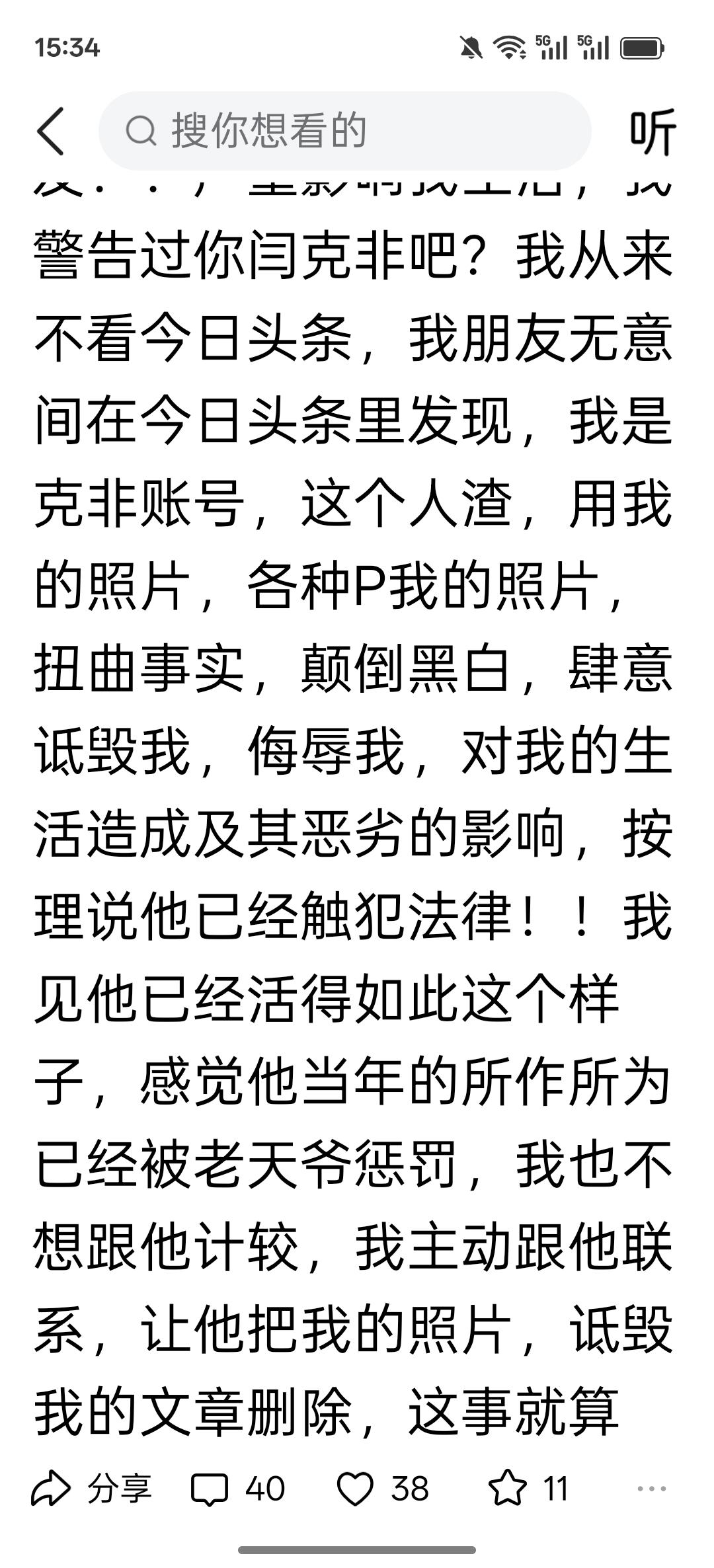 克非大哥,人设崩塌了? ”我是克非”是我关注的一位条友,他在文章中回忆自己的前半生。真可谓游戏人间啊!走过之处,人见人爱,花见花开。无论是大姑娘还是小媳妇,都像飞蛾扑火一样涌过来。不过他老人家也仗义,对女友舍得花钱,说是一掷千金也不为过,人生真是潇洒。 他的文章中还配了各个时期女友的图片,虽说脸上打了小兔子等马赛克,但是熟悉的人还是能够辨认出来的。当时我还想,这些女人够大度的,是不是应了那句话"分手以后我们还是朋友”。 不过这跟我认知中的女性不一样,我认为女人一旦不爱你了,那心中绝对是恨的,不可能这么大度。 这不,前女友搜集了证据,要他道歉,否则就要告他侵犯隐私和肖像权。并且前女友还曝了一些经济方面的料,看来克非也不像他说的那么潇洒多金,一掷千金。 眼看事情要闹大,克非大哥也只好先从头条撤退了。