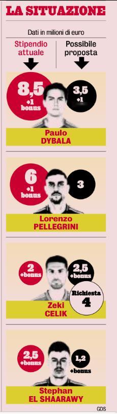 俱乐部的设想是为佩莱格里尼提供300万+奖金的续约报价,给迪巴拉最多也只能达到350万+100万奖金。给切利克的报价差不多250万+奖金,沙拉维倒是愿意降薪留下,但不只取决于经济条件。