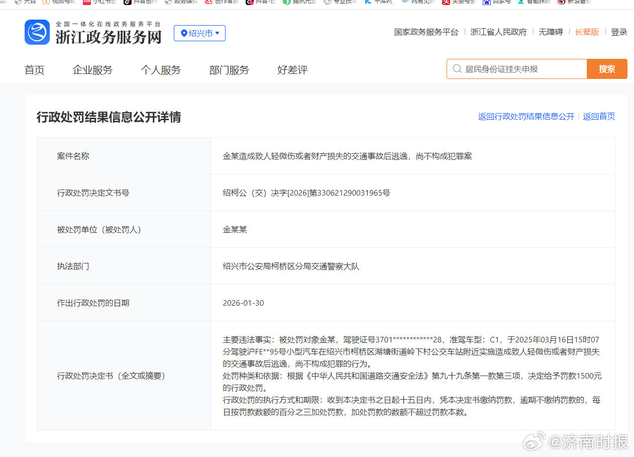 【#金晨肇事逃逸被罚1500元#】#金晨肇事逃逸不构成犯罪案# 7日,记者在浙江政务服务网查询到肇事逃逸事件处理结果:被处罚对象金某,驾驶证号3701************28,准驾车型:C1,于2025年03月16日15时07分驾驶沪FE**95号小型汽车在绍兴市柯桥区湖塘街道岭下村公交车站附近实施造成致人轻微伤或者财产损失的交通事故后逃逸,尚不构成犯罪的行为。处罚种类和依据:根据《中华人民共和国道路交通安全法》第九十九条第一款第三项,决定给予罚款1500元的行政处罚。行政处罚的执行方式和期限:收到本决定书之日起十五日内,凭本决定书缴纳罚款,逾期不缴纳罚款的,每日按罚款数额的百分之三加处罚款,加处罚款的数额不超过罚款本数。 浙江政务服务网行政处罚结果信息公开详情:网页链接