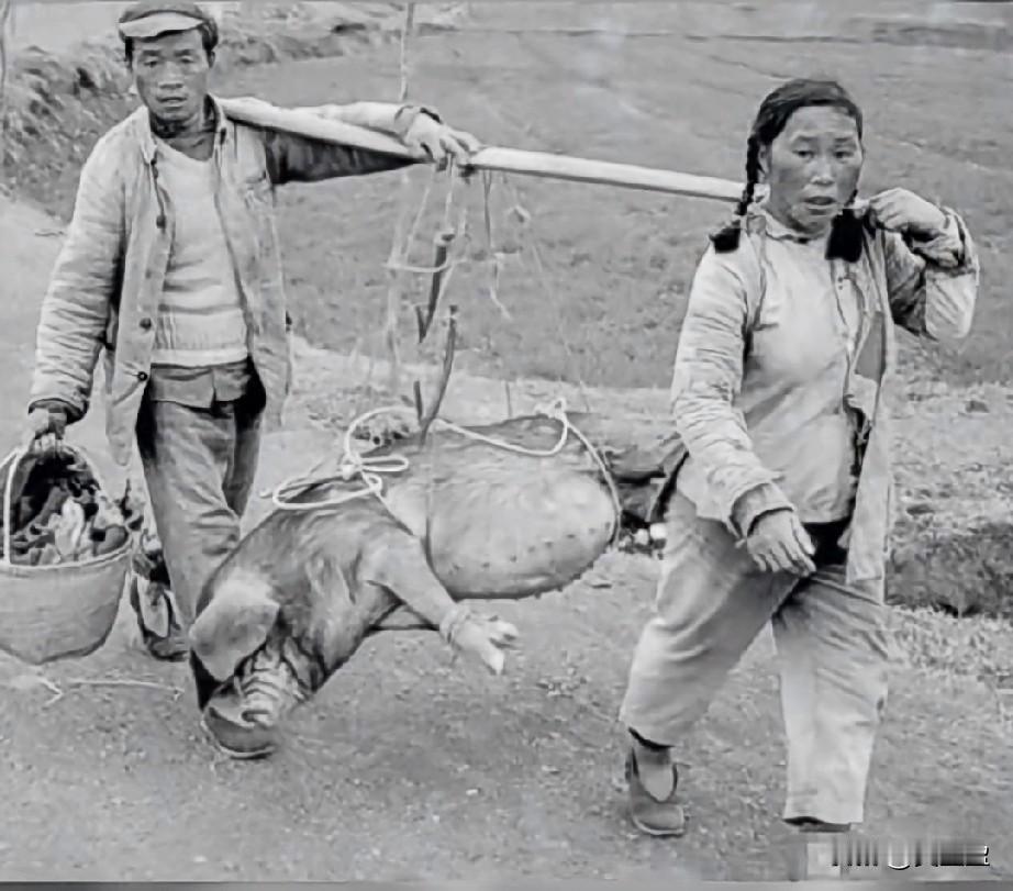 1965年, 一户农家夫妇抬着大肥猪前往集市进行售卖,他们穿着简朴,面对镜头也很是诧异,想来是没有见过照相机。