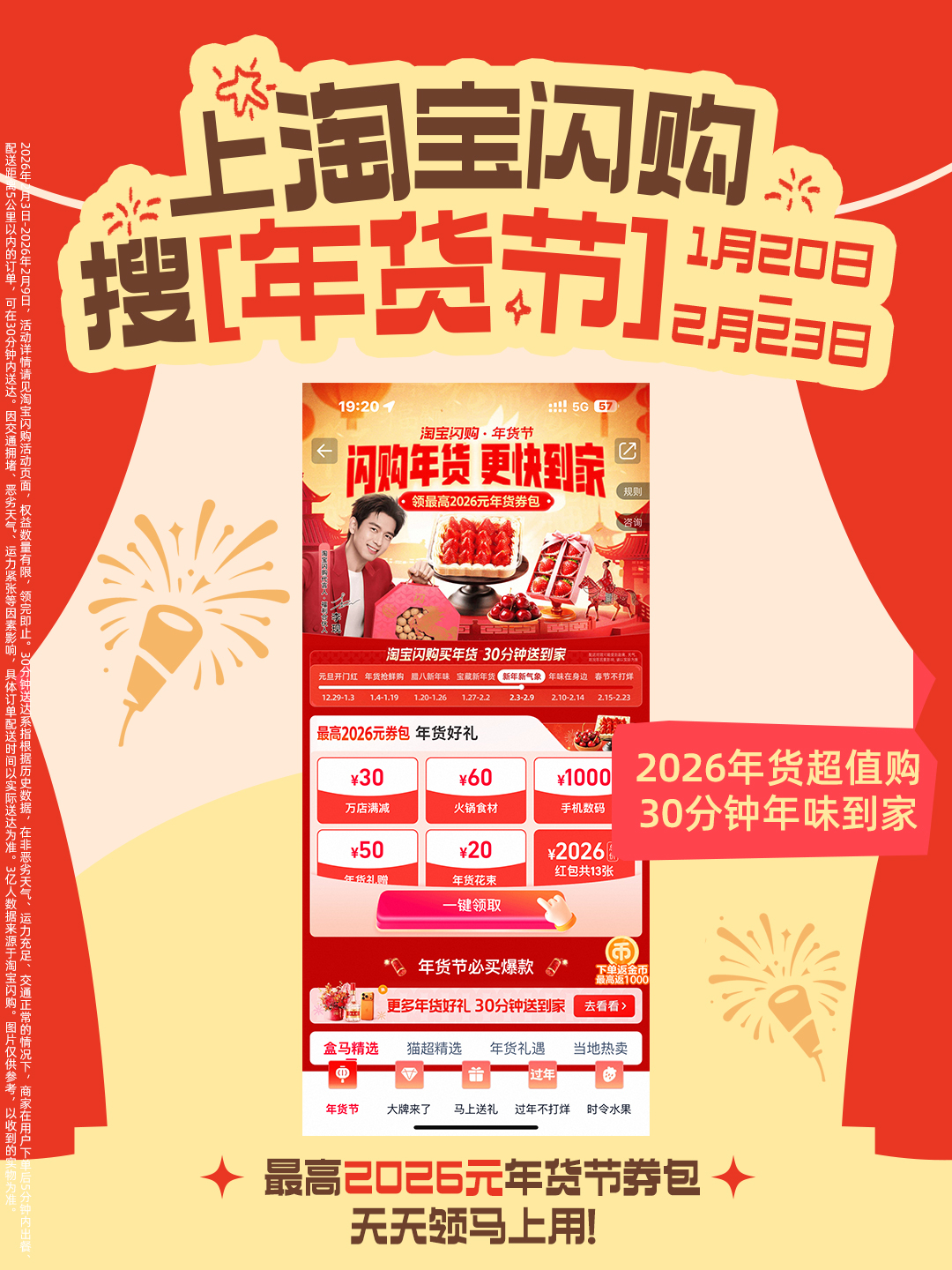 过年社交三件套 仪式感这东西,随时都能有!朋友聚会怕啥临时缺东西,淘宝闪购搜「年货节」,30分钟就到家!还有最高2026元年货节券包,天天领马上用!老己,不管什么时候我都会爱你!淘宝闪购年货节你的春运好搭子淘宝闪购年货节