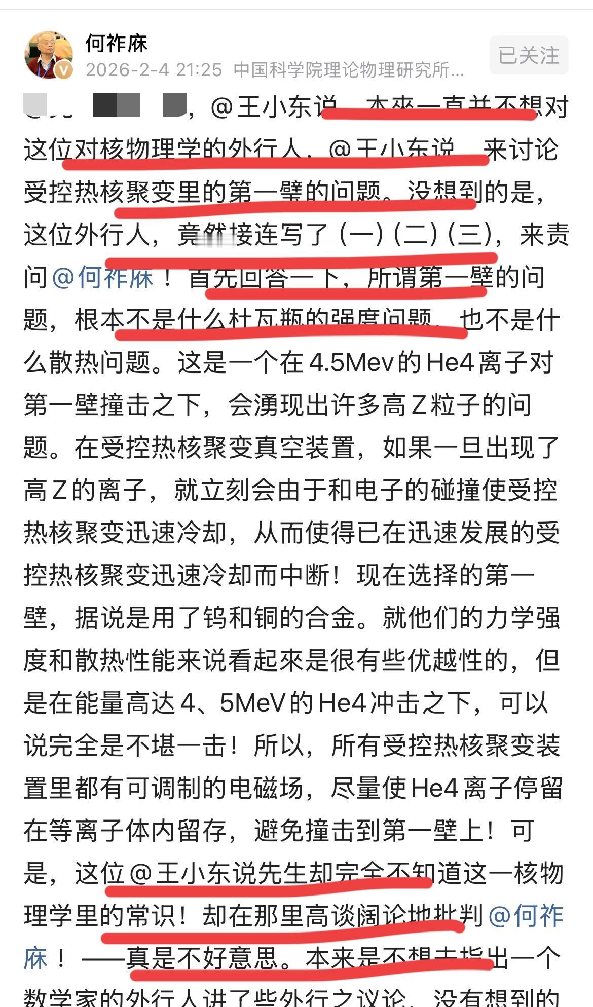 北大数学系毕业王小东教授突然发飙,剑指他的老朋友何祚庥院士!!他表示,我们已经攻克了核聚变的难关,而何祚庥院士也蒙在鼓里,还在看他的老黄历,认为我们没有能力攻克这个物理学难题,实际上,早就已经搞定了,只是没人告诉,和通知一天何院士~何老非常不爽,他说,本来不想理这个北大数学系毕业的物理学外行,但他却变本加厉,搞了一个连续剧视频,来攻击自己,是可忍,孰不可容!!他肯定反击一下这个自以为是的物理学大外行,以正视听!! 何老说,一个物理学常识都没有的外行,谁给你的勇气来批评物理学院士的?是啊,王老,谁给你的勇气,梁静茹吗? 最后一图是大概两三年前王小东会同朋友拜访何老的照片,当时气氛融洽,其乐融融,但没想到的是,很快王小东就翻脸了,简直翻脸比翻书还快,这是跟老朋友彻底决裂了吗,司马之后,有一位名人跟何老翻脸了,太遗憾了!你支持谁的观点呢,有何看法?