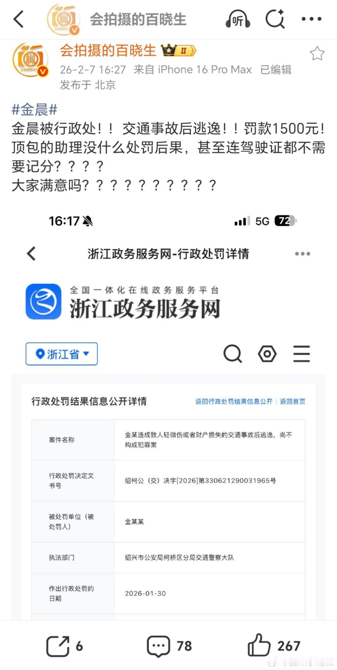 狗仔放出金晨被行政处 f 通知交通事故后逃逸,不构成犯罪,罚款1500元!那这算塌房吗?