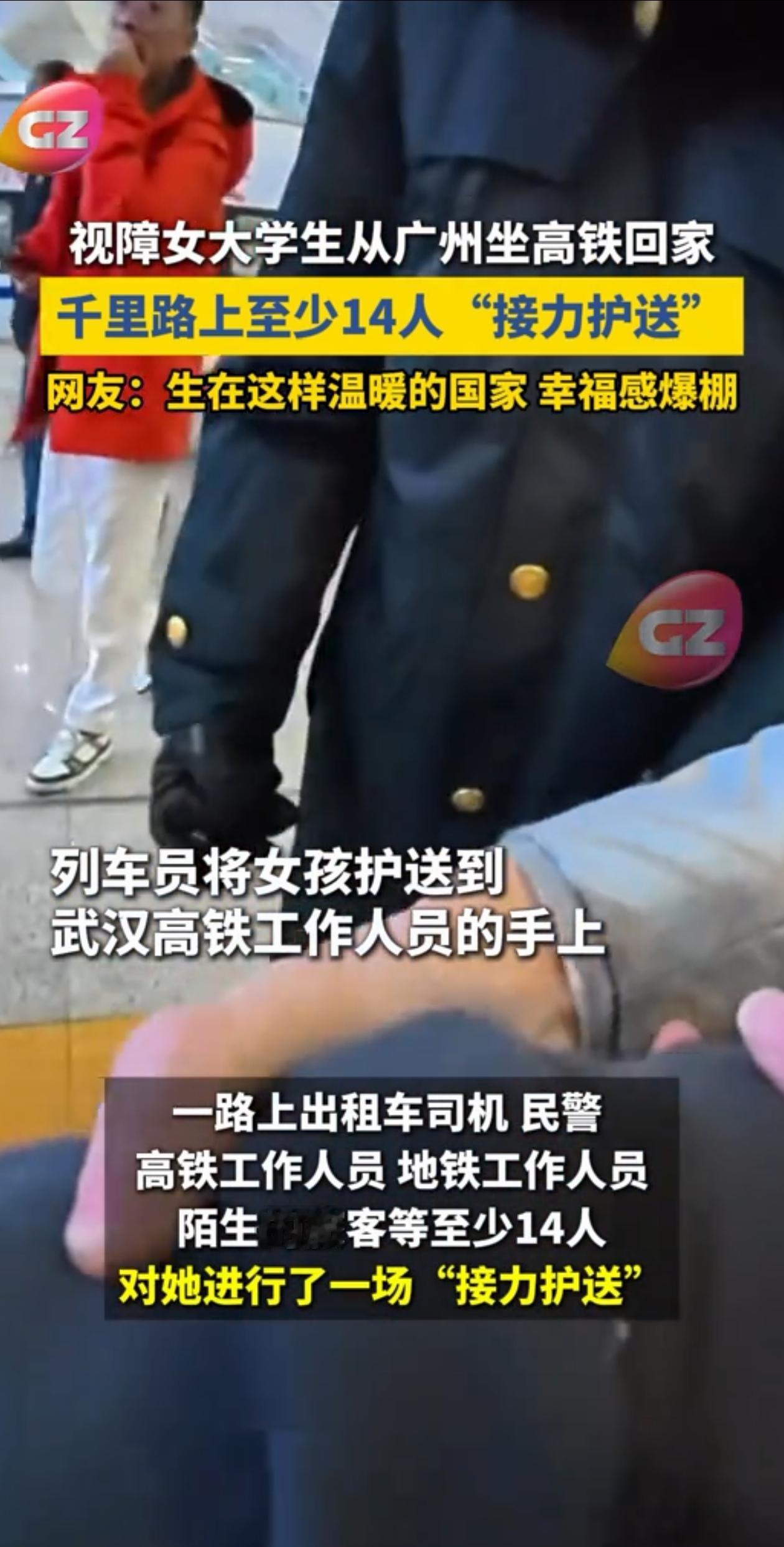 看哭了!广东广州,女大学生双目失明,又只能自己一个人坐高铁回武汉老家,本以为这趟路得费点功夫,没想到全程遇到14个好心人,让她一点磕磕绊绊都没有就安全到了家! 真是让人看着看着眼泪就不自觉的往下流啊。 这个女大学生叫李怡瑾,因为双眼失明,所以她平时出门都喜欢带着相机记录自己遇到的人和事儿。虽然她自己看不见,但能分享出来,让大家感受到世界的美好。 这次从广州回家,她先是打车去高铁站,没想到司机看见她情况特殊,到了地方之后还不放心走,非要找到一个工作人员,亲手把小李交到人家手上,这才放心离开。 之后上车的过程中,安检员和火车站的工作人员更是一路搀扶,不仅主动帮她拿行李,还时刻提醒她留意脚下。 让人感动的是,哪怕高铁到了武汉,武汉火车站的工作人员又来了一场接力,没有就这样让小李一走了之,而是主动带路,最后亲手把她送到在地铁站等候的父亲身边,这场接力相助的回家之旅才算告一段落。 回家之后小李把一路记录下来的旅途分享了出来,没想到看哭了不少网友。有网友说自己也曾帮助过一个盲人,对方一句谢谢让自己感动了一整天。也有网友感叹,这世界其实充满了爱。 其实大部分人骨子里都是善良的,遇到他人有困难,但凡自己能够帮忙,都愿意出手相助。从来不存在什么冷漠的大多数,有的只是一个又一个热心肠的普通人。 也希望随着未来科技的发展,能够出现一些辅助残障人士出行的高科技设备,这样哪怕没有人帮忙,他们自己也能够自在独行。
