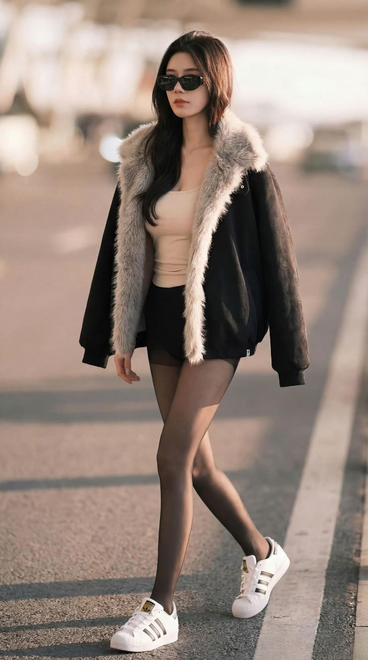 这套是甜酷辣妹风,很适合秋冬过渡季的出街造型~ 核心亮点是毛领棒球服外套(黑+灰白毛领),既保暖又自带贵气感;内搭裸色紧身吊带+黑色短裤,配上经典贝壳头小白鞋,甜辣感平衡得刚好,墨镜还增加了街头潮酷氛围。简搭棒球领外套