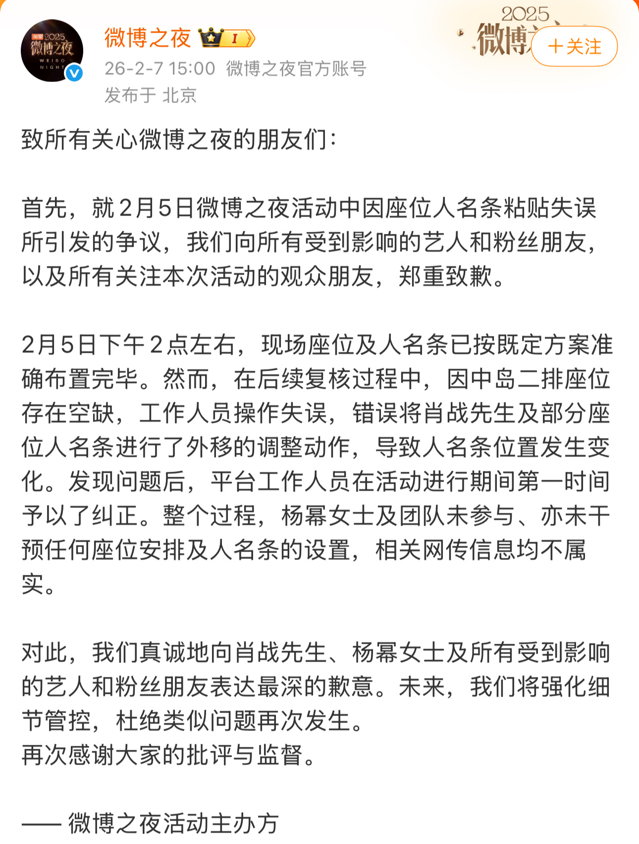微博之夜声明微博之夜名场面来了微博之夜官方两次道歉,第二次还点出了肖战和杨幂来单独道歉,更是澄清了是工作人员失误,和杨幂团队无关毕竟是去年的微博KING和QUEEN,有这个待遇,不然撕起来不好看微博之夜名场面微博之夜