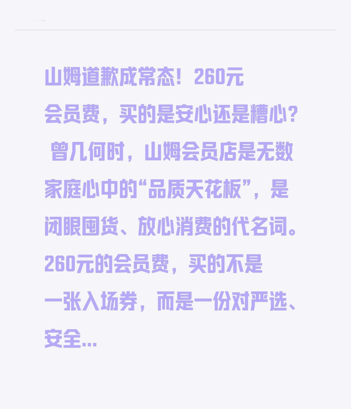 山姆道歉成常态!260元会员费,买的是安心还是糟心? 曾几何时,山姆会员店是无数家庭心中的“品质天花板”,是闭眼囤货、放心消费的代名词。260元的会员费,买的不是一张入场券,而是一份对严选、安全、靠谱的笃定信任。可不知从何时起,山姆道歉成了社交平台的固定节目,食品安全翻车、品控频频失守、售后敷衍了事,道歉声明发了一条又一条,问题却愈演愈烈。消费者不禁心寒发问:山姆的道歉,究竟是知错就改的诚意,还是屡教不改的“公关遮羞布”? 前不久刷屏全网的麻薯盒惊现活鼠事件,彻底击穿了大众的心理底线。密封包装、冷链配送、品牌背书,本该万无一失的网红麻薯,开箱竟窜出活鼠,糕点上清晰可见啃咬痕迹,惊悚画面让无数会员直呼“再也不敢买”。事发后,山姆第一时间发布道歉声明,却将责任轻描淡写推给“取货点周边环境”,一句“全链路未发现异常”,彻底暴露了敷衍态度。消费者花高价买会员,不是为了看品牌甩锅辩解,更不是为了在密封食品里与老鼠“不期而遇”。 这绝非偶然个案,而是常态化翻车的缩影。翻看近一年的投诉记录与热搜,山姆的“翻车名场面”多到数不清:奶油蛋糕暗藏毛发、新鲜草莓隔夜霉变、盒装牛奶变质发酸、生鲜肉类疑似虫卵、网红零食藏有异物、服饰商品溢价离谱……短短十天内五次食安问题爆发,每一次都以道歉收尾,每一次都换汤不换药,以至于网友调侃:“一周不看山姆道歉,都觉得日子少了点什么。”道歉,早已从应急公关,变成了山姆习以为常的“标准流程”。 一边是疯狂扩张、门店遍地开花,冲刺千亿营收的野心勃勃;一边是品控缩水、选品降级、供应链审核形同虚设,把“严选初心”抛之脑后。有内部员工爆料,为了追赶扩张速度、完成业绩KPI,山姆大幅压缩供应商审核周期,降低选品准入标准,一线员工超负荷运转,仓储、分拣、配送环节漏洞百出。曾经独一份的爆款好物悄然下架,取而代之的是随处可见的普通商品,会员费一分没降,商品品质却一降再降,260元普通卡、680元卓越卡,最终换来的却是一次次维权糟心。 更让消费者失望的是,山姆的道歉永远停留在文字里,从未落实到行动上。“深表歉意”“立即核查”“加强管理”,成了千篇一律的公关模板,可后续整改进度、责任追究、全链路升级方案,始终讳莫如深。面对消费者的合理投诉,门店要么推诿扯皮,要么只愿赔付小额优惠券,甚至出现客服态度恶劣、拖延处理、拒绝依法赔偿的情况。曾经以服务著称的山姆,如今尽显“店大欺客”的傲慢,一点点耗尽多年积累的品牌口碑。 付费会员制的本质,是信任与价值的双向奔赴。消费者愿意花钱办卡,是相信品牌能守住安全底线、保障商品品质、兑现服务承诺。当食品安全让位于扩张速度,当真诚整改让位于模板道歉,当会员权益沦为空谈,再强大的品牌也终将失去人心。如今,越来越多老会员选择主动退卡,转投其他商超,一句“山姆再也不是以前的山姆了”,道尽无数消费者的失望与无奈。 千亿规模的野心,不该以牺牲食品安全为代价;快速奔跑的脚步,不该丢掉最基本的商业良知。一句轻飘飘的道歉,抵不过一次实实在在的整改;一篇华丽的公关文,换不回已经崩塌的消费者信任。如果山姆依旧沉迷于“道歉—翻车—再道歉”的循环,只顾扩张不顾品质,只重公关不重售后,最终只会被用脚投票的消费者彻底抛弃。 你在山姆踩过哪些坑?收到过几次毫无诚意的道歉?260元会员费,你觉得现在还值得吗?评论区留下你的经历,点赞转发,让更多人看清山姆的道歉套路,守护自己的消费权益。山姆选购攻略 山姆会员 山姆好物测评 山姆体验