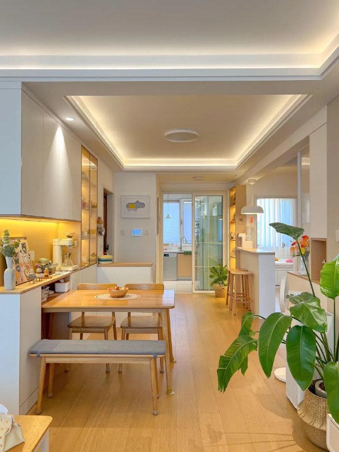 阳台打通、地板通铺、搭配白色木饰面,确实显大,原木风两房给大家参考