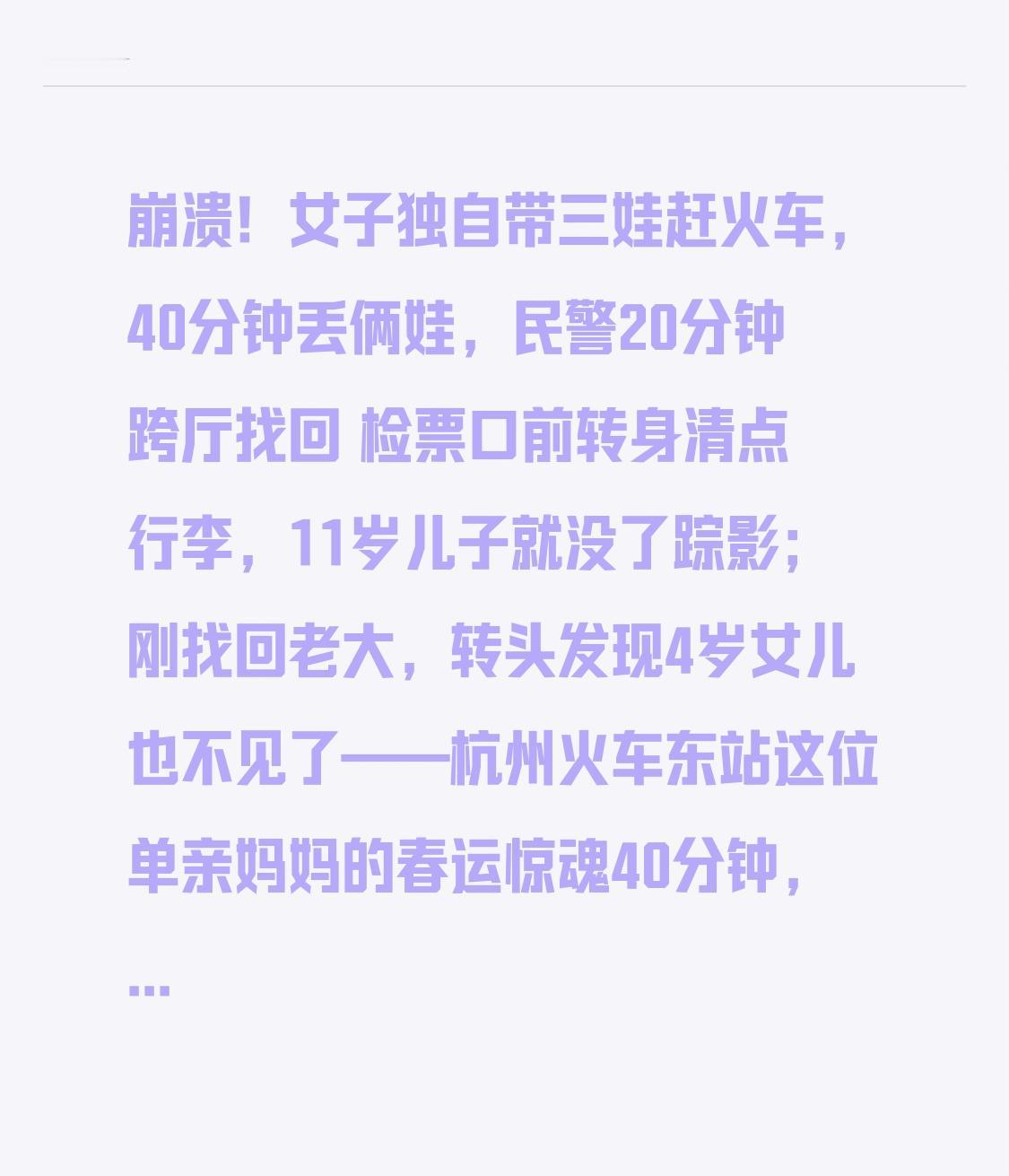 崩溃!女子独自带三娃赶火车,40分钟丢俩娃,民警20分钟跨厅找回 检票口前转身清点行李,11岁儿子就没了踪影;刚找回老大,转头发现4岁女儿也不见了——杭州火车东站这位单亲妈妈的春运惊魂40分钟,看得人手心冒汗!独自带三娃出行本就不易,接连丢失两个孩子,换谁都得崩溃,可这场惊险背后,藏着所有家长都该警惕的安全隐患。 2月5日下午,杭州东站迎来春运客流高峰,候车大厅里人潮涌动、人声嘈杂。30多岁的张女士背着硕大的行李包,一手推着婴儿车(里面是襁褓中的三女儿),一手紧紧牵着4岁的二女儿,还要盯着身旁患有孤独症的11岁大儿子,准备搭乘高铁返回温州。为了给三女儿看病,她独自带着三个孩子在杭州奔波多日,归心似箭的她没料到,意外会突然降临。 “马上检票了,我低头整理下尿不湿,回头就看不到老大了!”张女士回忆,当时28B检票口前排起长队,她忙着照料小女儿,让大儿子在身边等候,可短短几十秒的分心,孩子就消失在人群中。情急之下,她只能先推着婴儿车、拉着二女儿,顺着人流往站台方向寻找,却始终不见大儿子的身影。眼看列车即将发车,张女士不得不放弃登车,带着两个孩子返回候车大厅四处搜寻,最终在25A检票口旁的商店里找到了正在挑选零食的大儿子。 积压的疲惫与焦虑在这一刻彻底爆发,张女士拉着儿子在大厅角落大声斥责,情绪激动到难以自控。可就在热心旅客拨通铁路民警电话、民警赶来安抚时,更惊险的转折点出现了:“糟了!我女儿呢?”张女士突然发现,一直拉着的二女儿竟不见了踪影。此时她的手机恰好没电,无法联系他人,只能语无伦次地向民警描述孩子特征:“穿红色棉袄,4岁,喊她可能不会应声……”接连丢失两个孩子的打击,让这位独自支撑家庭的母亲瞬间蹲在地上失声痛哭。 接到求助后,杭州东站派出所民警立即启动应急处置预案,兵分三路开展搜救:一组调取监控追踪女童轨迹,发现孩子因害怕母亲斥责,趁混乱独自向西服务台方向跑去,多次被人流裹挟;二组携带孩子照片对商铺、卫生间等重点区域地毯式排查;三组通过车站广播循环播放寻人信息。春运期间车站日均客流量超15万人次,每一分钟都至关重要,好在20多分钟后,执勤民警在西服务台附近发现了独自徘徊哭泣的小女孩,成功将其带回。 看到两个孩子都平安找回,张女士红着眼眶向民警连连道谢。考虑到一家人错过列车且带着三个孩子出行不便,民警还主动协助办理了改签手续,当晚将他们安全送上返程高铁。这场有惊无险的经历,不仅让张女士后怕不已,也给所有春运出行的家长敲响了警钟。 铁路公安部门数据显示,春运期间儿童走失案例中,80%以上是家长疏忽大意导致,进站安检区、检票口、站台、商铺都是走失“重灾区”。独自带娃出行的家长,更要牢记这些防走失技巧:给孩子穿颜色鲜艳的衣物,便于快速识别;制作“身份信息卡”缝在孩子衣服内侧;人流密集区域务必牵手或使用防走失绳,确保孩子在一臂范围内;提前和孩子约定,走散后不要乱跑,找穿制服的工作人员求助。 张女士的遭遇是幸运的,有惊无险找回了孩子,但并非所有走失都能圆满结局。春运的意义是团圆,而团圆的前提是安全。每一位家长都该紧绷安全这根弦,少一分分心,多一分警惕,用细致的看护为孩子筑起安全屏障。 如果你也认同“带娃出行安全第一”,点赞转发,提醒身边的家长朋友,让每一场归乡之旅都充满温暖与安心,让这个马年春节的团圆更加圆满!