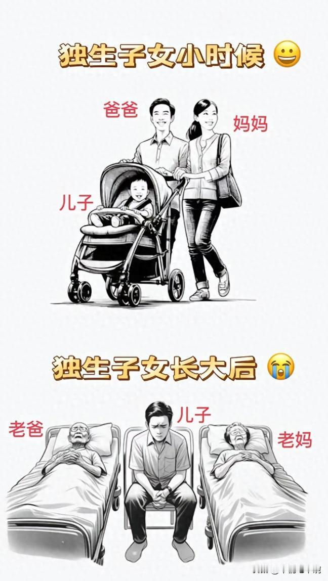 一个非常不好的消息:中国超2亿独生子女面临的非常严峻问题。根据官方统计,中国独生子女的数量早已经超过了2亿,如果算上这几年新增的数据,实际规模可能更大。 说白了,这2亿多独生子女,看似是从小被捧在手心的一代,如今却成了被生活按在地上摩擦的一代,上扛四个老人,下顾儿女家庭,中间还得硬扛生活的暴击,没处躲也没处逃。 可能有人会说,有钱不就啥都解决了?这话确实没毛病,那些经济富裕的家庭,父母养老能请护工,请一两个甚至更多保姆轮流照料,独生子女不用亲自扎在医院和家里,思想和体力上都能松口气,顶多就是多花点钱,不用被压得喘不过气。 但绝大多数都是普通家庭,这些家庭的独生子女,才是真正的难,难到连崩溃都得挑时间。 他们的压力从来都不是单一的,思想上要时刻紧绷着,担心父母生病没人管,担心自己倒下了全家就垮了,夜里翻来覆去睡不着,满脑子都是老人的养老、家里的开支。 体力上更是连轴转,父母住院要昼夜陪护,下班要赶回家做饭收拾,周末连个休息的时间都没有,长期下来,身体和精神双重透支,根本吃不消。 更让人揪心的是,这其中还有一部分人,没工作、没收入,找不到稳定的营生,只能靠着父母微薄的养老金勉强糊口,啃老不是他们愿意的,却是实实在在的无奈。 还有几千万独生子女,干着极不稳定的工作,可能今天有活干,明天就失业,没有固定收入,却要承担起全家的重担,光是房贷、车贷就压得他们抬不起头,更别说应对老人的医疗开销。 现在国家鼓励生育二胎,可有没有真正考虑过独生子女的承受能力?本来一个孩子的养育成本就不低,从奶粉、早教到上学、买房,每一笔都是不小的开支。 要是再生二胎,他们要面对的就是四个老人的养老、两个孩子的养育,再加上源源不断的房贷、车贷,仅凭夫妻两个人的力量,根本难以支撑,没有国家的政策帮扶,没有实际的补贴和支持,谁敢轻易生二胎? 其实这个问题,早就不该再让独生子女独自硬扛了,是时候让国家来兜底,这份责任本就该由政府来承担。 独生子女的父母,当年响应国家号召,只生育一个孩子,如今他们年老体衰,养老金微薄,要是国家没有对应的帮扶措施和政策,不提高他们的养老金待遇,不减轻独生子女的赡养压力,很多普通家庭迟早会被这沉重的负担压垮。 以上仅为个人看法,不代表任何立场,不知道屏幕前的你,有没有同样的感受?如果你也是独生子女,正在承受这些压力,或者你有不同的想法,欢迎在评论区留言讨论。