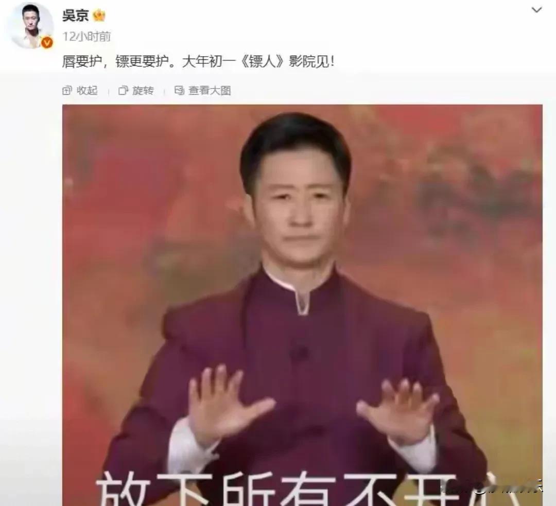 吴京在微博之夜被拍到偷偷涂唇膏,那手速快得像在执行秘密任务,涂完还不好意思地挡脸,网友都笑他像上课偷吃零食怕被老师抓包的学生。战狼也要护唇啊,这反差太逗了。 面对热搜,吴京回应绝了:“唇要护,镖更要护。” 一句话,既大方承认,又顺带宣传了大年初一上映的新电影《镖人》。这情商,真是高手! 大家不仅没笑话他,反而觉得他真实可爱,打破了“硬汉不能精致”的刻板印象。这事告诉我们,真实比完美人设讨喜多了。期待京哥的新电影! 吴京回应唇部紧急护理