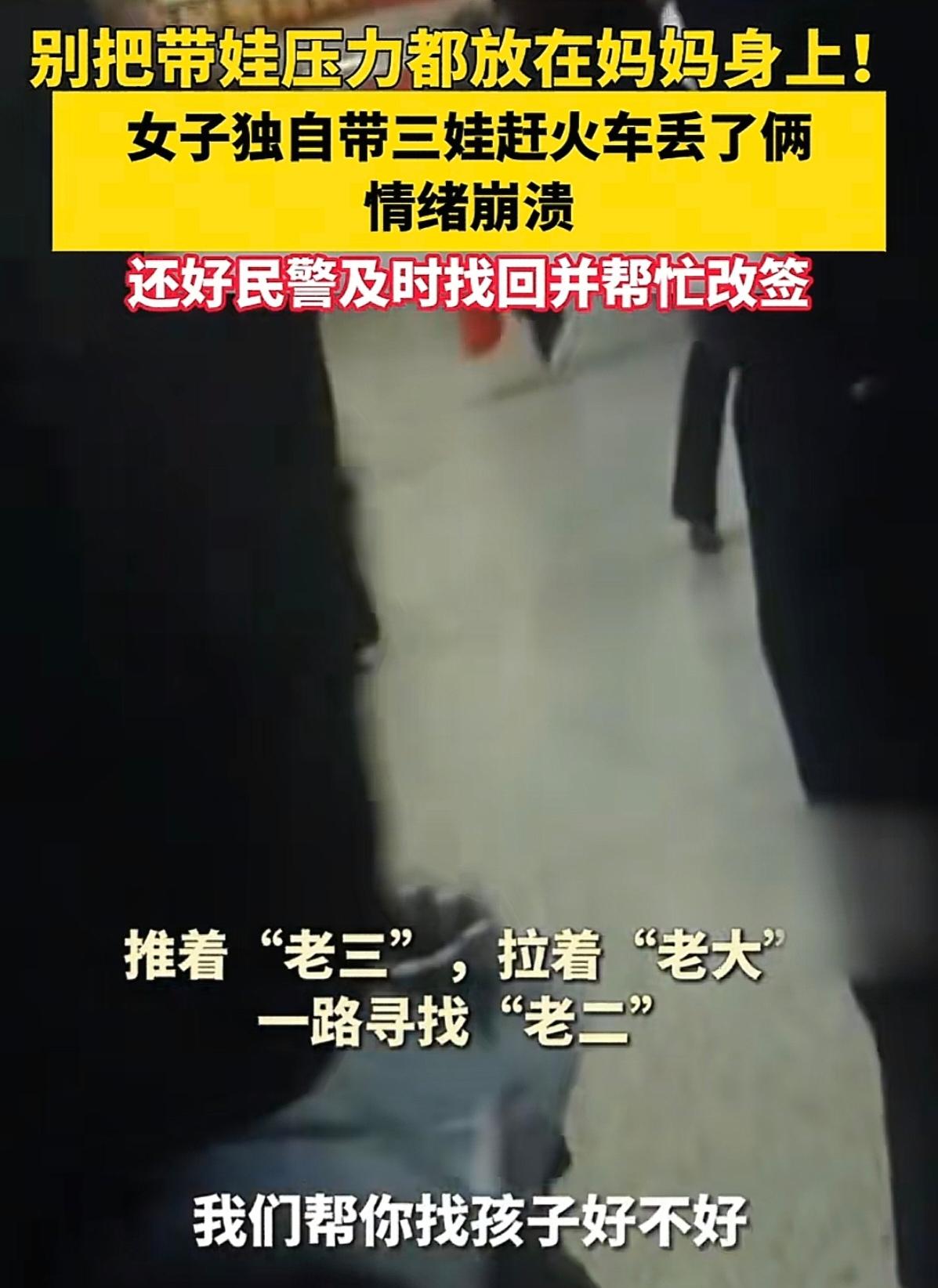 一个人带三个娃,车站接连丢两个,崩溃背后全是撑不住的苦! 这件事,看着揪心,听着心酸。 二月五号傍晚,杭州东站人特别多。张女士一个人出远门,身上背着大包小包的行李。她推着一辆婴儿车,车里是年纪最小、需要看病的孩子。身边还跟着四岁的小女儿,以及患有孤独症的大儿子。一家人出门,全靠她一个人照看。 高铁快要发车,车站里人声嘈杂。她低头收拾东西,再一抬头,大儿子不见了。她急得到处找,整个人都慌了。找到孩子那一刻,她绷了很久的情绪直接垮掉。她大声说话,不是发脾气,是真的撑不住了。 有人报了警,民警很快赶到现场。大家还在安抚她,她突然发现身边的小女儿也没了踪影。她整个人都僵住,不敢相信眼前的事。民警立刻分头找人,在候车大厅另一头的服务台附近,找到了走出去很远的小女孩。 她一个人要顾着生病的老三,盯着四岁的老二,还要守着需要格外看管的老大。出门看病、赶火车、搬行李,所有事都压在她一个人身上。人的精力是有限的,长时间紧绷,一慌就容易顾此失彼。 车站人多、声音杂、脚步急,孩子小又不懂危险。特殊孩子需要时刻不离视线,小一点的孩子又爱乱跑。她不是不想看好,是真的看不过来。 民警一路帮忙,把她们一家人安全送上回家的高铁。事情有惊无险,可背后的辛苦,只有她自己最清楚。生活压得人喘不过气,母爱再坚强,也有扛不住的时候。 多给独自带娃的人一点体谅,少一点指责,比什么都重要。