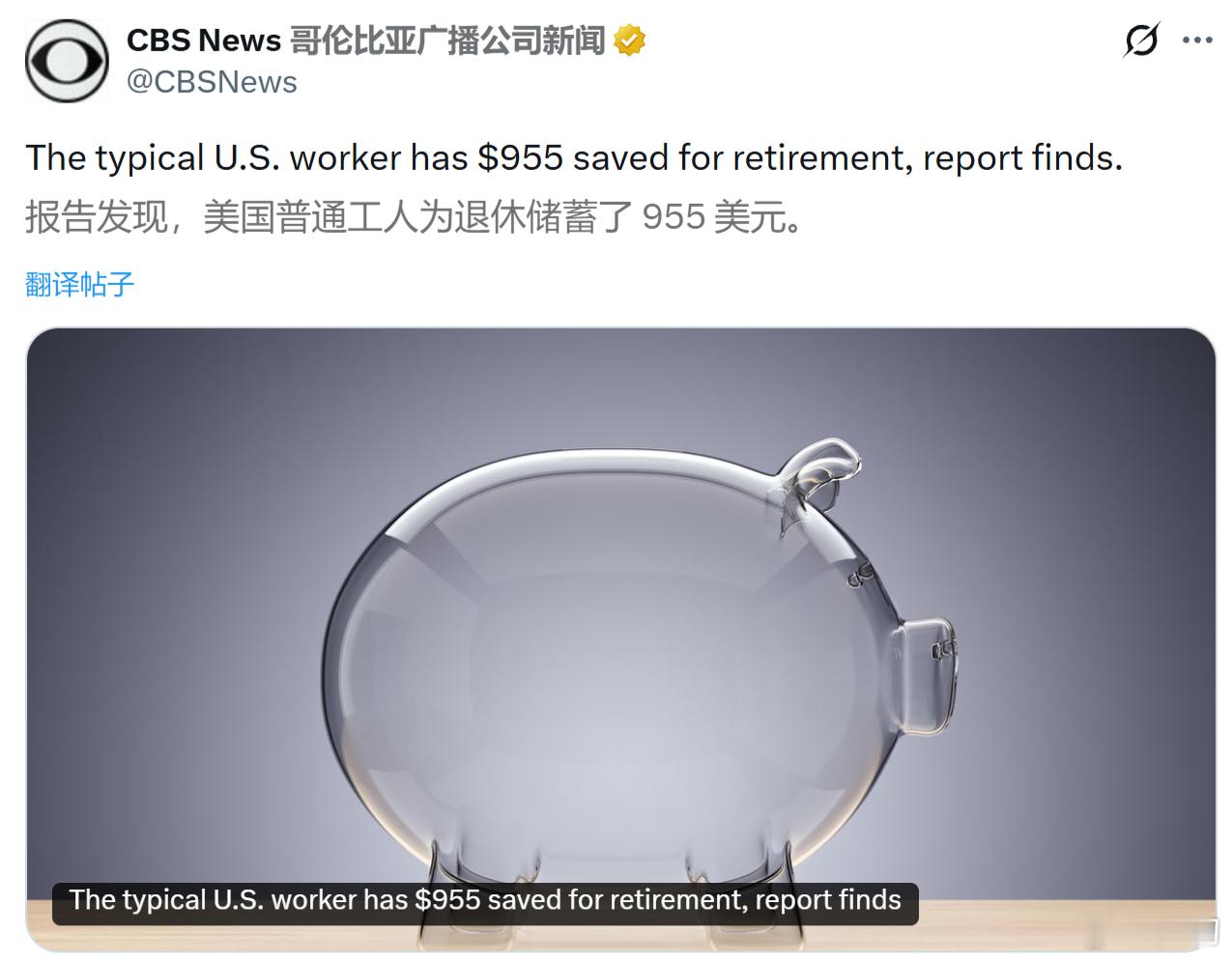 《哥伦比亚广播公司》:根据美国国家退休保障研究所的一份新报告,美国普通工人退休储蓄不足 1000 美元,这凸显了数百万人在老年时可能面临的经济压力。该数据既包括拥有401(k)和其他退休计划储蓄的员工,也包括约 5600万无法享受雇主提供的退休计划的美国员工。这家无党派智库利用美国人口普查局的收入和项目参与调查数据发现,21岁至64岁所有就业成年人的储蓄中位数为955美元。工作了一辈子,勉强成为万元户。