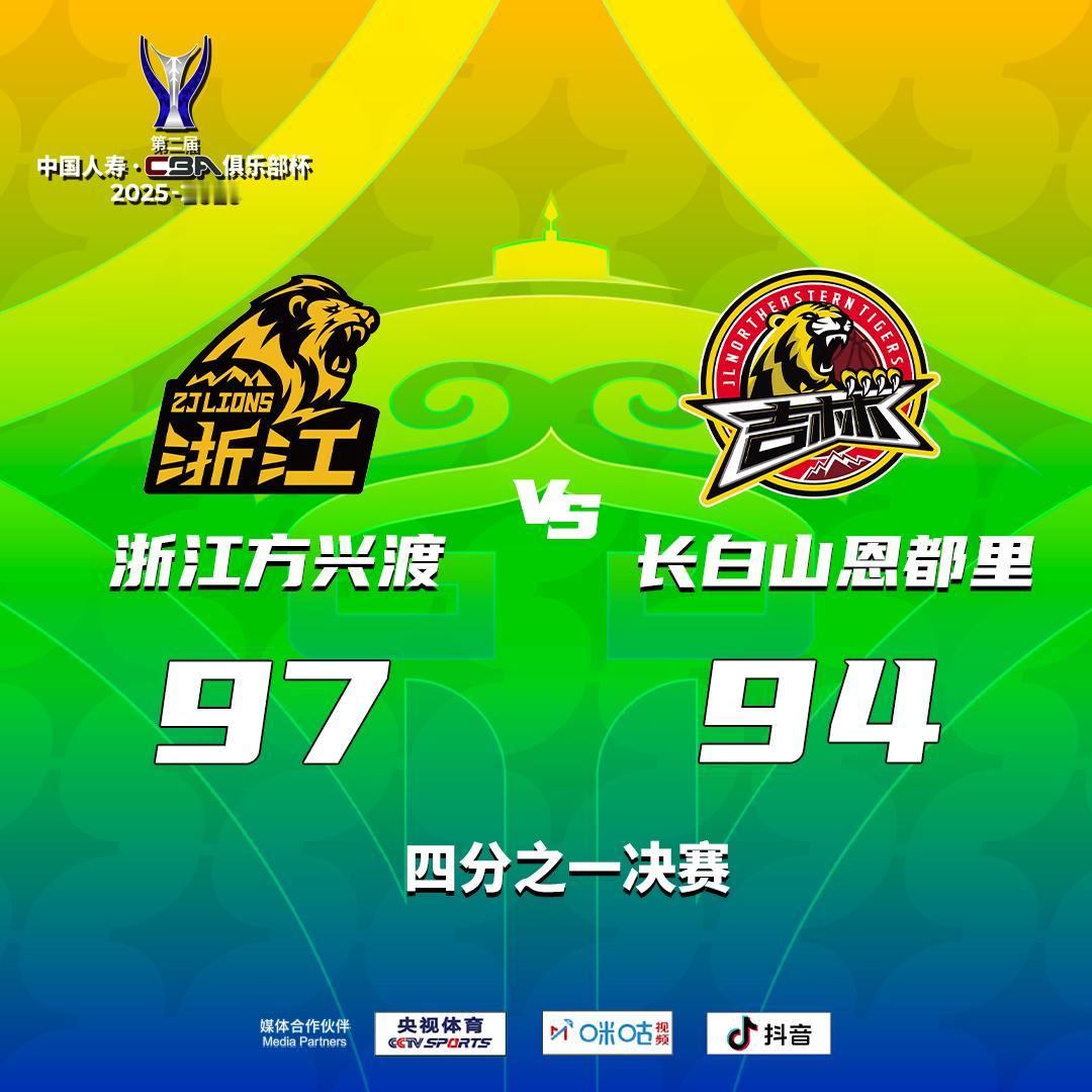 浙江方兴渡 97-94 长白山恩都里CBA杯广厦男篮战胜吉林男篮 浙江方兴渡:塔克48分6篮板11助攻2抢断,桑普森20分11篮板,卡尔顿16分5篮板; 长白山恩都里:栾利程18分3助攻,段立谦14分4助攻,威尔逊12分4篮板。CBA俱乐部杯赛