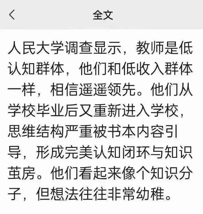 中国人民大学从未发布过“教师是低认知群体”的调查 所谓“人大调查”,是指人大2024年《全国公众科技创新认知度调查报告》 ,但原报告根本没有“教师认知低、和低收入群体一样、相信遥遥领先”这类表述。 “从学校毕业又进学校、认知闭环、知识茧房、想法幼稚”等表述,是2024—2025年在微博、小红书、抖音流传的反教师偏见段子,被造谣者冠上“人大调查”的名头来增加可信度。 这段话全网检索无权威来源,属于三无谣言(无作者、无发布单位、无原文链接)。造谣