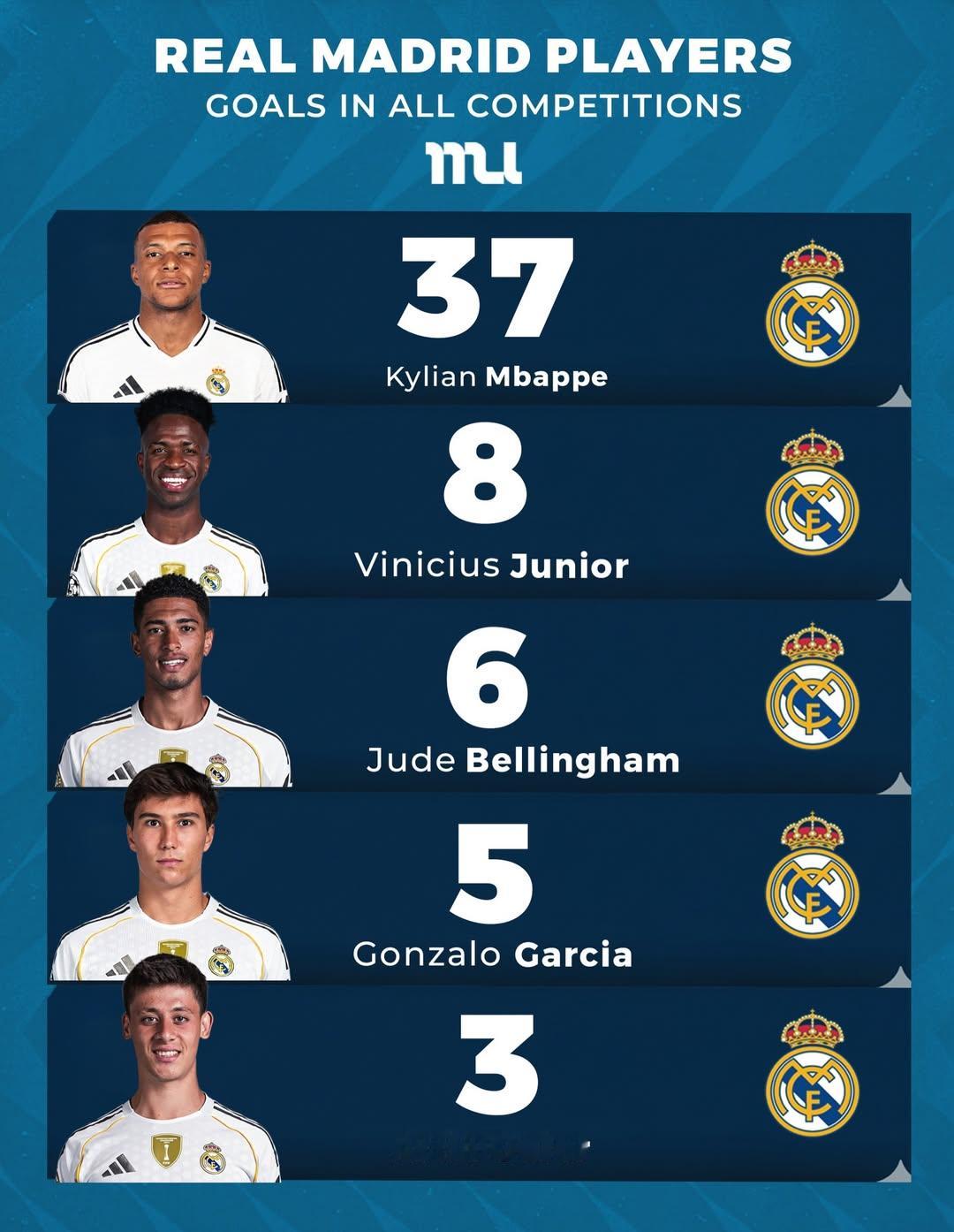 皇家马德里本赛季各项赛事射手榜⬇️🏅️姆巴佩断层领先皇马