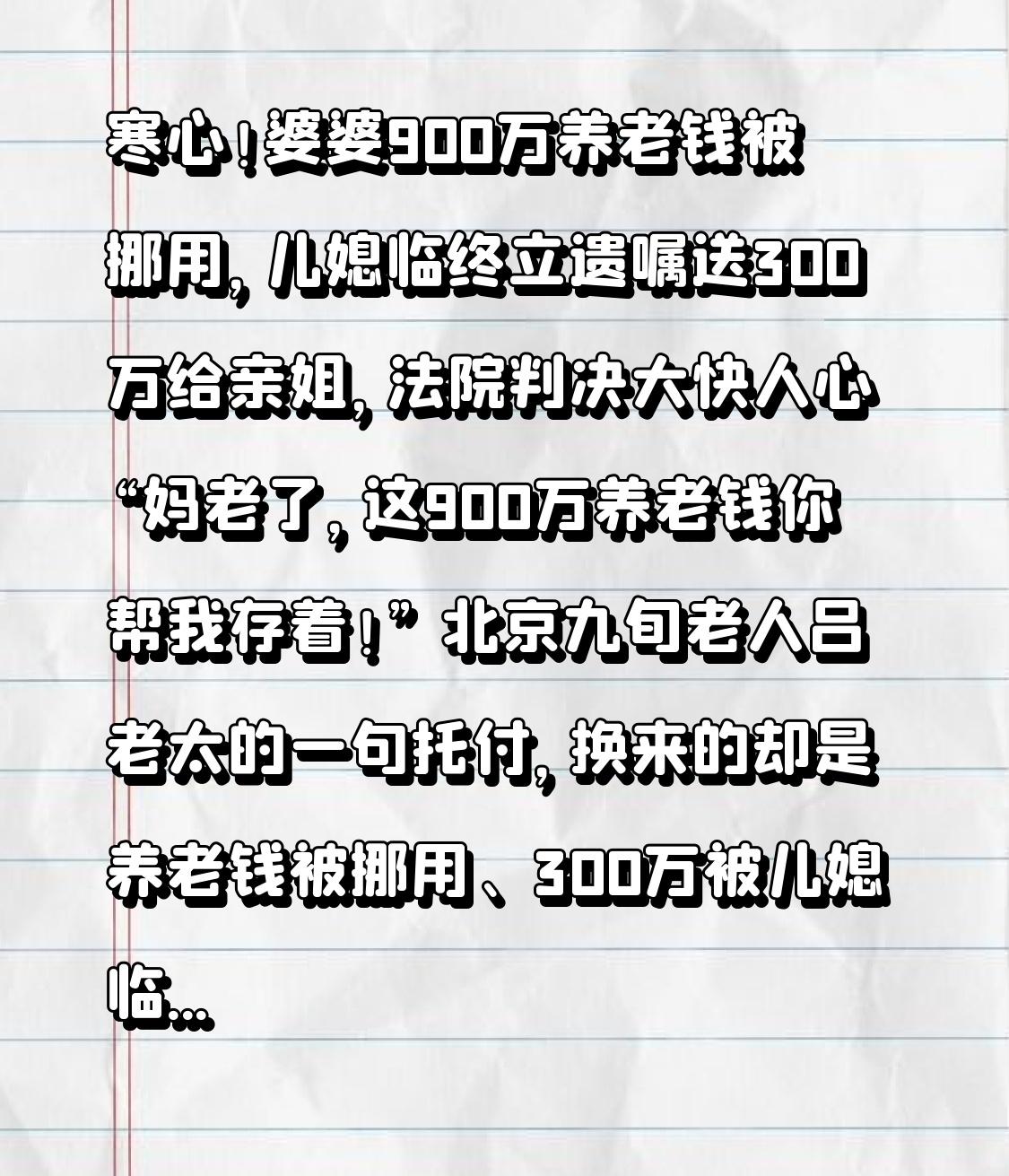 寒心!婆婆900万养老钱被挪用,儿媳临终立遗嘱送300万给亲姐,法院判决大快人心 “妈老了,这900万养老钱你帮我存着!” 北京九旬老人吕老太的一句托付,换来的却是养老钱被挪用、300万被儿媳临终赠给亲姐的结局。这场跨越6年的亲情信任崩塌,让无数人愤怒又揪心,而法院的判决,终于为老人守住了最后的底线! 2018年,86岁的吕老太因行动不便、记性衰退,卖掉住了一辈子的北京老房子,将900多万房款全部交给独子吕某,只说了一句“帮我存着,这是我的养老钱、看病钱”。没有借条,没有协议,只有母子间血浓于水的信任。吕某满口答应,可他没告诉母亲,这笔钱很快成了夫妻二人的“提款机”。 从2018到2021年,这笔养老钱被陆续用于偿还夫妻共同房贷、装修新房、覆盖日常开支,小两口住着用老人积蓄支撑的房子,却对吕老太绝口不提资金使用情况。吕老太沉浸在对儿子的信任中,丝毫没察觉自己的“保障”正在被一点点掏空。 最让人寒心的转折点发生在2022年7月。吕某的妻子乔某乙病重临终前,竟立下一份荒唐遗嘱:将名下房产50%份额和300余万元存款,全部留给自己的亲姐姐乔某甲,其余财产归丈夫吕某。而这300万“存款”,正是吕老太委托儿子保管的养老钱!乔某乙用一份遗嘱,把别人的养老钱当成自己的财产,送给了自家亲人。 直到2024年,91岁的吕老太偶然查询账户,才发现自己的900万积蓄早已所剩无几,300万还被“送”给了外人。一辈子的血汗钱、晚年的依靠,竟成了儿媳送人的“人情”,老人悲痛欲绝,毅然将儿子和儿媳的姐姐告上法庭。 庭审中,争议焦点直击核心:这笔钱是赠与还是保管?儿子吕某辩称是母亲“赠与”,儿媳姐姐更是主张“遗产合法继承”,试图逃避责任。但法院的判决给出了明确答案,这是最解气的转折:结合银行流水、当事人陈述等证据,法院认定吕老太与吕某构成保管合同关系,而非赠与或借贷,款项用于夫妻共同生活属于共同债务,乔某甲作为遗产继承人,需在继承范围内承担清偿责任。最终判决吕某全额返还900余万元,乔某甲在继承遗产范围内承担还款责任。 网友们看完纷纷怒怼:“这哪里是保管,分明是侵占!”“亲情在巨款面前不堪一击”“还好法律守住了底线”。其实这场纠纷的本质,是亲情与财产的边界失守。吕老太的信任没有错,但口头托付的风险,让别有用心的人有了可乘之机。根据《民法典》规定,老年人对个人财产享有完整处分权,子女不得擅自处置,受托人应当妥善保管财物,擅自挪用需承担返还责任。 此案也给所有家庭敲响警钟:父母委托子女保管大额财产,一定要签订书面协议,明确用途和返还条件,不要让口头承诺成为亲情的“漏洞”;子女更要明白,父母的养老钱不是家庭“备用金”,透支信任最终会透支亲情;而继承人在接受遗产前,也需查清财产来源,避免继承“烫手财产”引发债务风险。 91岁的吕老太赢了官司,却可能再也找不回曾经纯粹的母子亲情。这场悲剧提醒我们:亲情再深,涉及大额财产也要“先小人后君子”,明确的约定不是不信任,而是给亲情加一道保护栏。毕竟,真正的亲情,从来不会觊觎父母的养老钱,更不会把别人的信任当成谋利的工具。 你觉得父母的养老钱该如何保管才安全?亲情与金钱该如何平衡?点赞转发,一起聊聊你的看法,也提醒身边的长辈,守护好自己的养老钱,才是晚年幸福的底气!