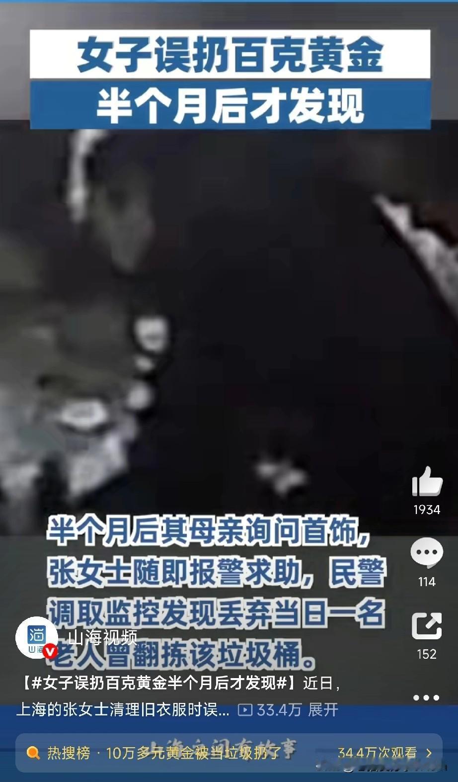 给老人打扫卫生,可不要乱扔东西,说不定里面就藏着宝贝。 上海的张女士大扫除时,把母亲的旧衣服扔掉了,藏在旧衣服里的百克黄金首饰(价值十几万啊!)也当成垃圾扔了! 更离谱的是,半个月后母亲突然问起首饰,她这才反应过来,吓得赶紧报警求助! 民警调取监控发现,丢垃圾当天,一位老人翻拣了那个垃圾桶。找到老人后,对方一脸懵:“我以为是镀金的旧饰品,就随手收着了,谁知道这么值钱啊!” 得知真相后,老人二话不说就把黄金全数归还,真是好人呐! 这事简直太惊险了! 张女士事后心有余悸:“幸好遇到好心的老人,不然真不知道咋办!以后家里老人的东西,必须问清楚了再扔!” 给大家提个醒: ✅ 老人爱“藏宝”:很多老人喜欢把贵重物品藏在衣柜、旧衣服里。收拾老人房间时,一定要提前沟通,别随手乱扔! ✅ 大扫除要仔细:金银首饰、重要证件别和杂物堆在一起!贵重物品单独收纳,避免手滑扔掉。 丢了东西别慌:第一时间报警查监控!有时候好人就在身边,比如这位拾金不昧的老人! (文章素材来自山海视频,侵删)