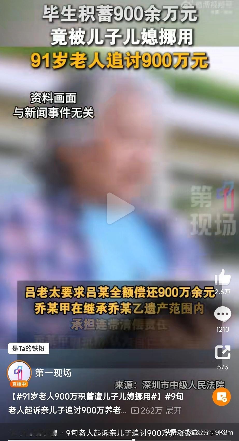 这坑妈的儿子 深圳91岁的吕老太,辛苦一辈子攒了900万,因为年纪大行动不便,信任儿子吕某,让他帮忙“保管”积蓄。 结果呢?这钱全被儿子儿媳拿去还房贷、搞装修、付生活费,花了个精光! 更离谱的是,儿媳去世后立遗嘱,把名下房产和300万存款给了亲姐姐,老人一分没落着! 老人发现钱没了,找儿子要说法,对方居然翻脸不认账!没办法,91岁的老太太只能把亲儿子和儿媳的姐姐告上法庭! 法庭上,儿媳姐姐还狡辩说钱是老人“送给”儿子的,自己不用还。但法院可不是吃素的! 福田法院审理后明确认定: 这不是借款:没借条,也没说过要还。 也不是赠与:老人和儿子都否认,900万养老钱说送就送?太扯了! 是委托保管:老人年纪大+母子关系+钱被小两口全花了=保管合同,而且算夫妻共同债务! 最终判决:儿子必须全额还钱!儿媳姐姐在继承遗产范围内也要负责还钱! 这波法律撑腰,必须点赞! 这事给咱提了个醒: 老人信任子女可以,但钱的事必须说清楚!写个协议或收据,明确是“保管”不是“送”! 子女也别把老人的钱当自己的,啃老无底线,法律可不答应! 遗嘱、财产分配得按规矩来,别想钻空子! 这真是坑妈的儿子,老人该咋保护自己的养老钱呢? (文章素材来自第一现场,侵删)