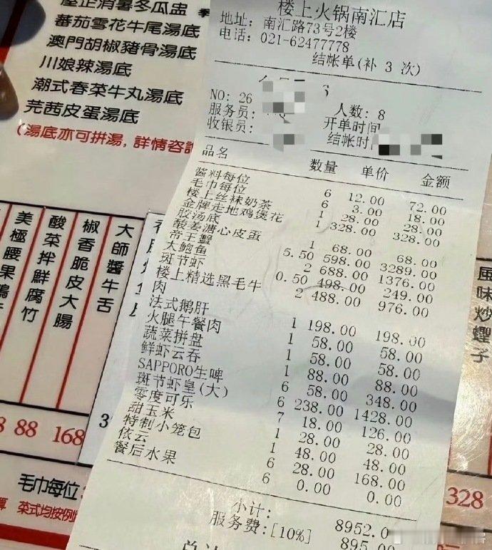 EXO上海吃火锅账单 六人火锅吃出九千多,八百服务费太抢眼,这沪币消费直接刷新认知,欧巴们是真壕气!EXO上海吃火锅消费近一万