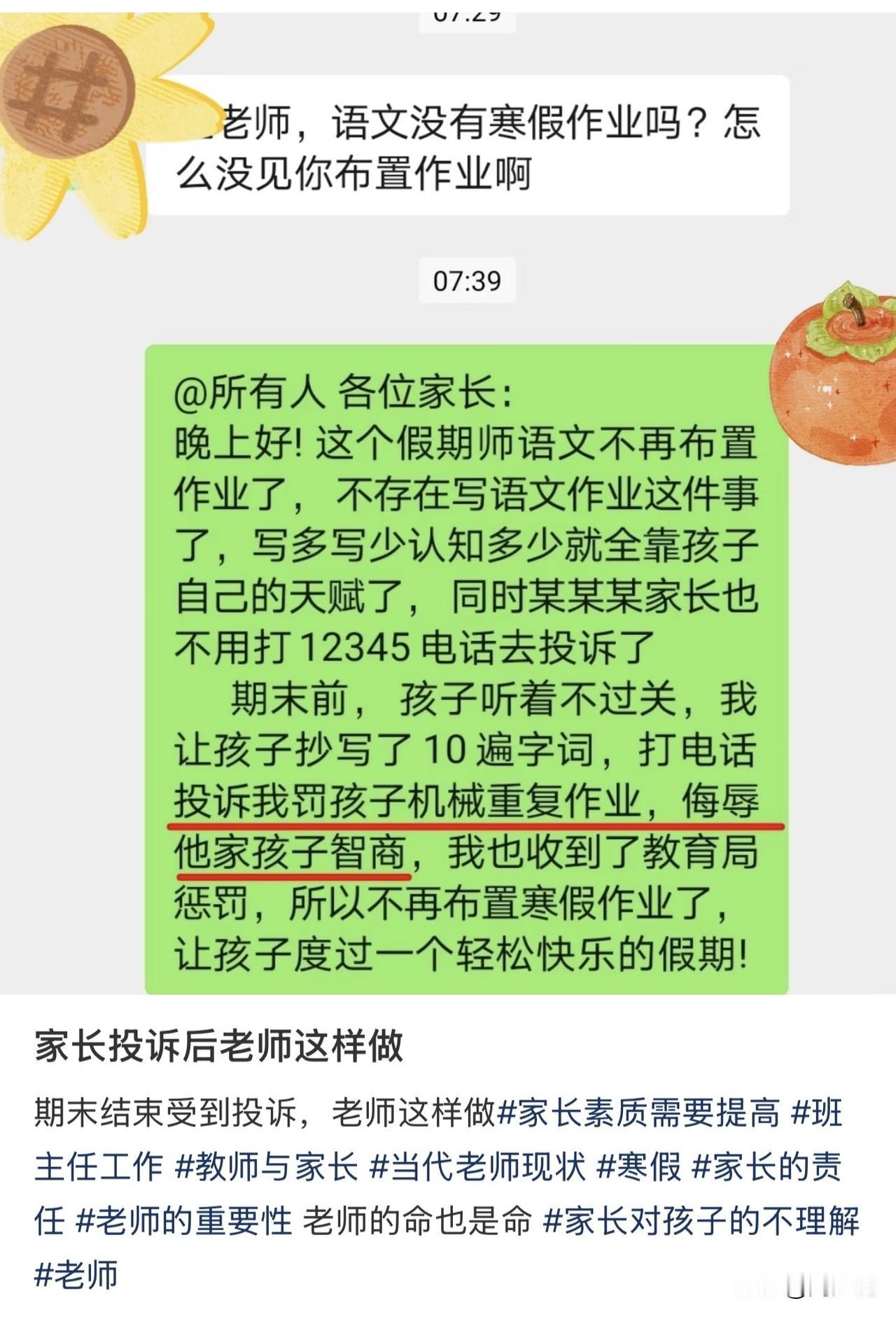 “这位老师干得漂亮!”网传一张截图,期末考试结束,一位家长在班级群里问语文没有寒假作业吗?结果,这位老师回复,不再布置作业了,全靠孩子天赋,也省得有人打12345投诉。原来期末时,这位老师让字词不过关的孩子抄10遍,竟被家长投诉“机械重复作业,侮辱了他家孩子的智商”,还收到了教育局惩罚。 此截图在网上流传以后,网友热议炸开了锅。有网友说:“10遍字词算惩罚?基础巩固而已,家长是不是太玻璃心了”。 也有网友说:“老师怕麻烦干脆躺平,最终吃亏的还是孩子”。 还有网友表示:“确实,投诉是家长的权利,但如此较真,难免让老师寒了心。” 在周少看来,这件事里没有绝对的对错,却藏着教育最无奈的困境。老师布置少量抄写作业,初衷大概率是帮孩子夯实基础,而非刻意为难;家长重视孩子的学习体验,这份用心也能理解。但沟通的缺失,让小事发酵成矛盾。 教育从来不是单方面的付出,更需要家校之间的互相体谅。家长若对作业有异议,不妨先和老师耐心沟通,而非直接投诉;教育局的惩罚,是不是也该多些调研,而非简单一刀切?老师因一次投诉就取消作业,看似赌气,实则是对教育热情的消耗。 可以说,教育的温度,藏在彼此的包容里。过度维权会捆住老师的手脚,一味妥协也难让孩子真正成长。家校各退一步,多些换位思考,或许才能给孩子更健康的学习环境。毕竟,没人希望老师不敢教,孩子不愿学。#寻美三湘#