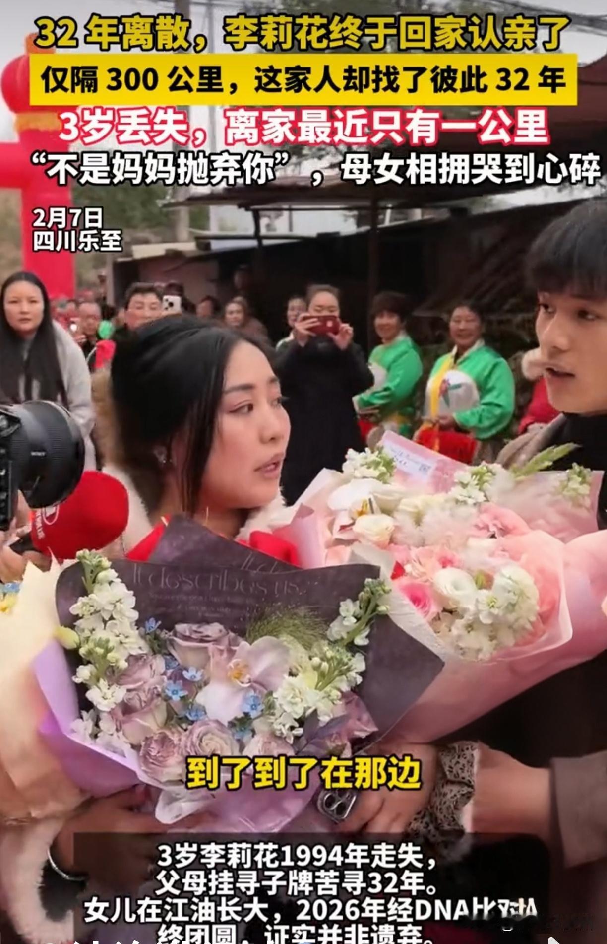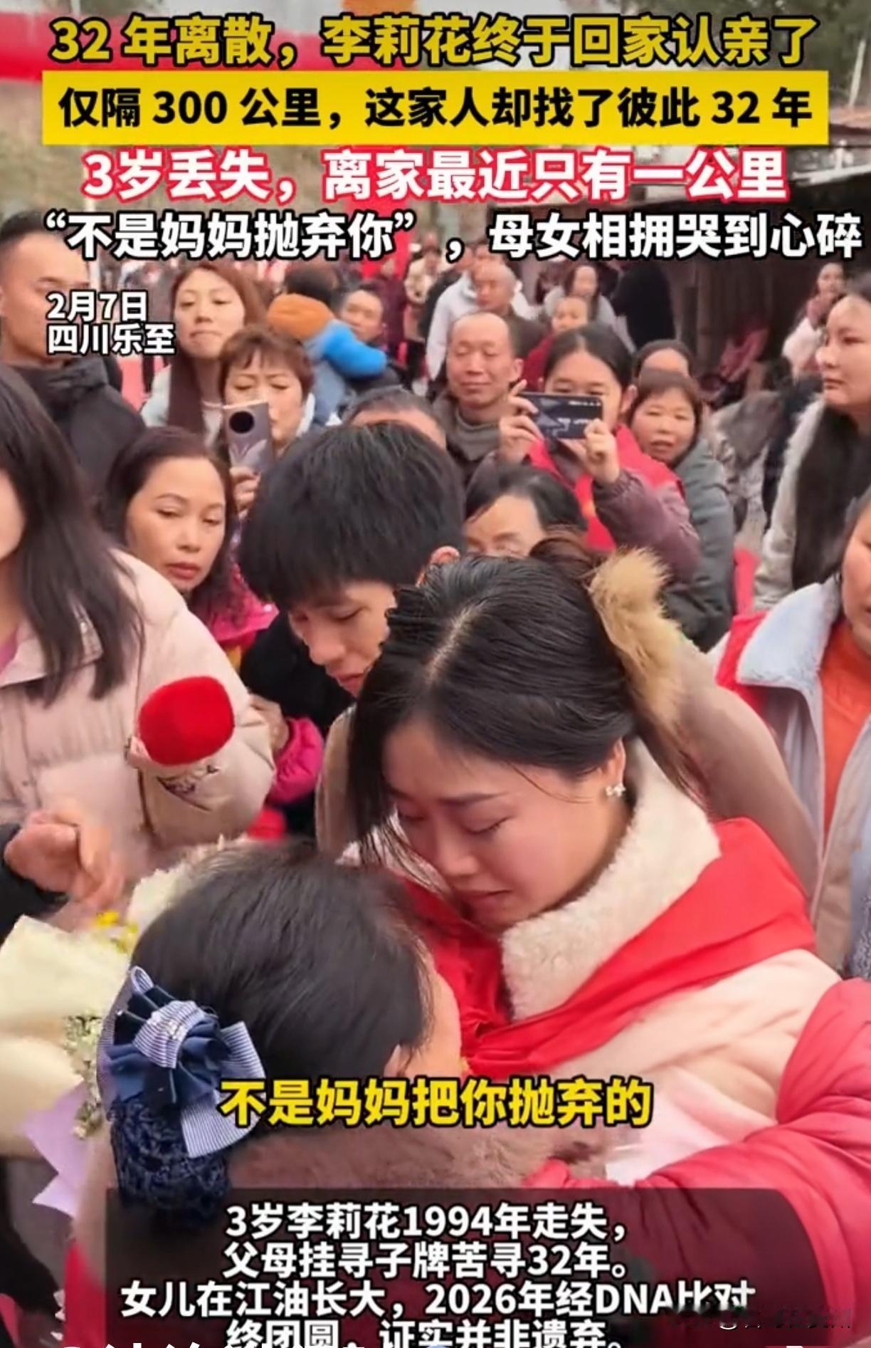 32年啊,只隔300公里!母女竟擦肩而过,认亲时一句话让全网泪崩 32年,一万多个日夜,她就在300公里外,最近时甚至只隔1公里!3岁走失的李莉花,昨天终于扑进妈妈怀里。母女抱头痛哭,妈妈反复只说一句话:“不是妈妈抛弃你……” 就这一句,所有委屈和眼泪都值了。 这哪是300公里,这分明是家人用脚一步步量出来的32年啊!孩子丢的那天,整个家就塌了。她爸把寻人启事贴遍了半个省,她妈听见一点消息就往外冲,无数次希望又无数次落空。最扎心的是什么?有几次,他们其实就和李莉花在同一个镇上,可能曾在同一个菜市场擦肩,可能在同一个车站等车——最近的一次,直线距离不到1公里,却像隔着整个宇宙。 日子一天天过,李莉花长大了,成了家,可心里总缺一角。她模糊记得家门口有棵枣树,记得妈妈哼过的调子。而另一边,她爸妈头发白了,背驼了,唯独找女儿这件事,从来没停。他们学会了上网,在“宝贝回家”网站登记,一遍遍对着镜头说:“闺女,回家吧。” 这份执念,不是固执,是爱在时间里熬成了骨血。 认亲现场,所有人都哭了。妈妈冲上去抱住她,手抖得厉害,摸她的脸,看她的眼睛,好像要把32年的缺失一次看够。那句“不是妈妈抛弃你”,不是一个解释,是32年煎熬的出口——她怕女儿心里有根刺,怕女儿以为自己是不要的孩子。而李莉花哭到站不住,只会说“妈,我回来了”。那一刻,时间好像折叠了,3岁的小女孩穿过32年光阴,终于跑回了家。 但故事最戳我的,不是团圆,而是“1公里”的残酷玩笑。命运有时就这么弄人:你以为远在天边,其实近在眼前;你以为被遗忘,却有人用一生在找你。这1公里,丈量的是亲情的力量——它可以让一家人跨越最远的“近”,也能让时间在等待面前失去意义。 我们总以为“丢”了的人很难找,可有没有可能,有些温暖就在我们眼皮底下,只是被日常忽略了? 如果你也被这份坚守打动,点个赞,留下“团圆”二字。更想问问你:你觉得,是什么支撑了一个家32年不放弃? 评论区里,说说你的故事和感悟。愿每个走散的孩子,都能找到回家的路。宝贝回家 32年寻亲团圆 亲情永不褪色 寻亲成功案例