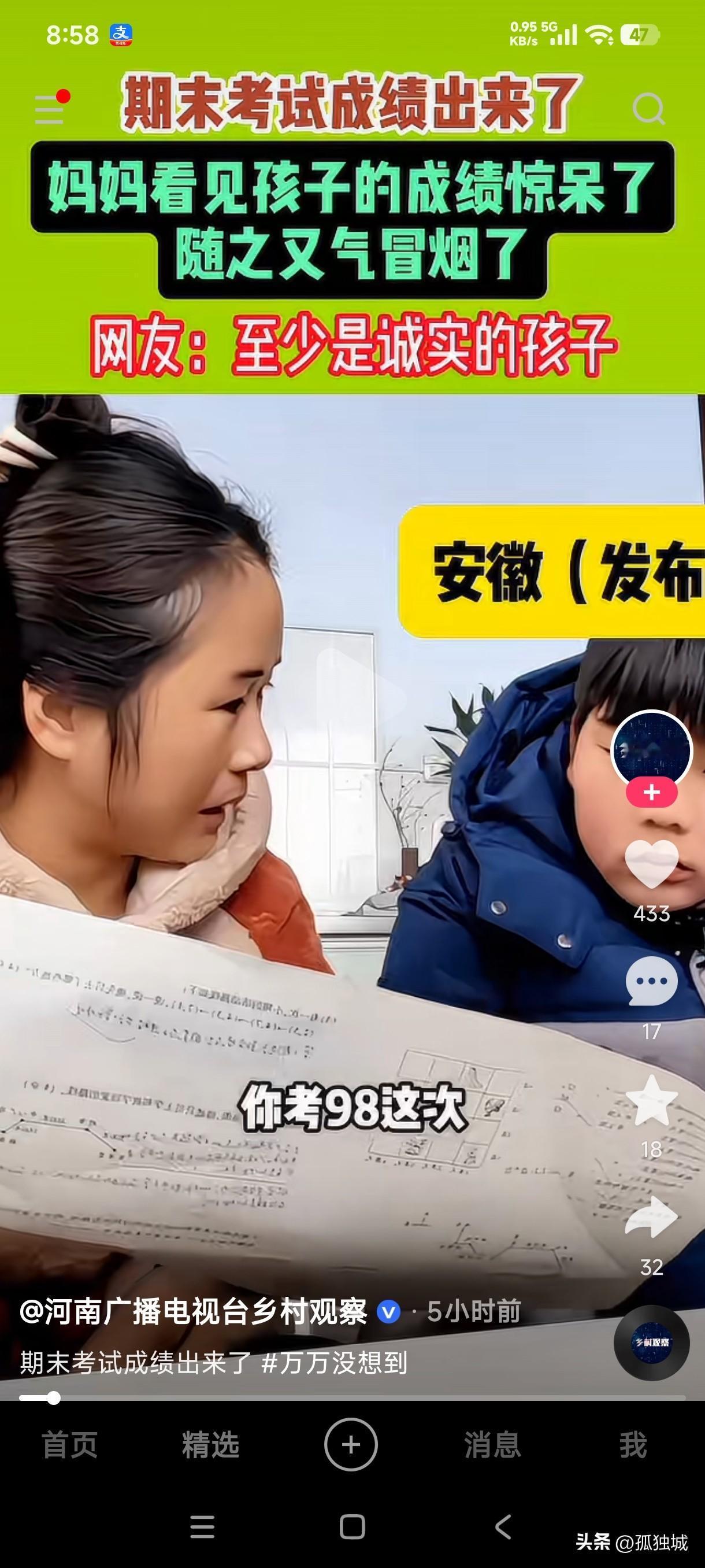 期末考试成绩出来后妈妈看到孩子考了98分瞬时惊呆了,立马就说上饭店好好奖励孩子一顿,仔细一看又气的冒烟了,这到底是该上饭店奖励还是该用鞋底奖励? 作为父母大多数人都希望孩子能考个好成绩,但并不是所有当父母的人都能如愿以偿,这女子第一眼看到孩子考了98分瞬时惊讶的连自己都有点不相信,连忙问孩子考了98分,应该上饭店好好庆祝一下,可是接下来女子仔细一看卷子上满是❌号,这98分到底是如何考的,又问孩子到底是咋弄的,结果孩子还算诚实,居然说是自己涂上去的。 对于学习当中的孩子来说,努力和天赋是共存相辅相成的,两者缺一不可,但是真正有这种机缘巧合的人又有几个,这孩子虽说他成绩不好,但至少他是诚实的,他能给妈妈实话实说不是吗?妈妈看到孩子诚实的份上是不是应该请他美味一顿,毕竟学习也是需要天赋的不是吗?