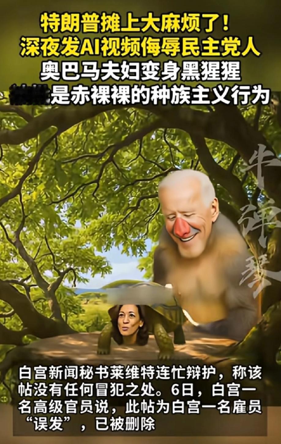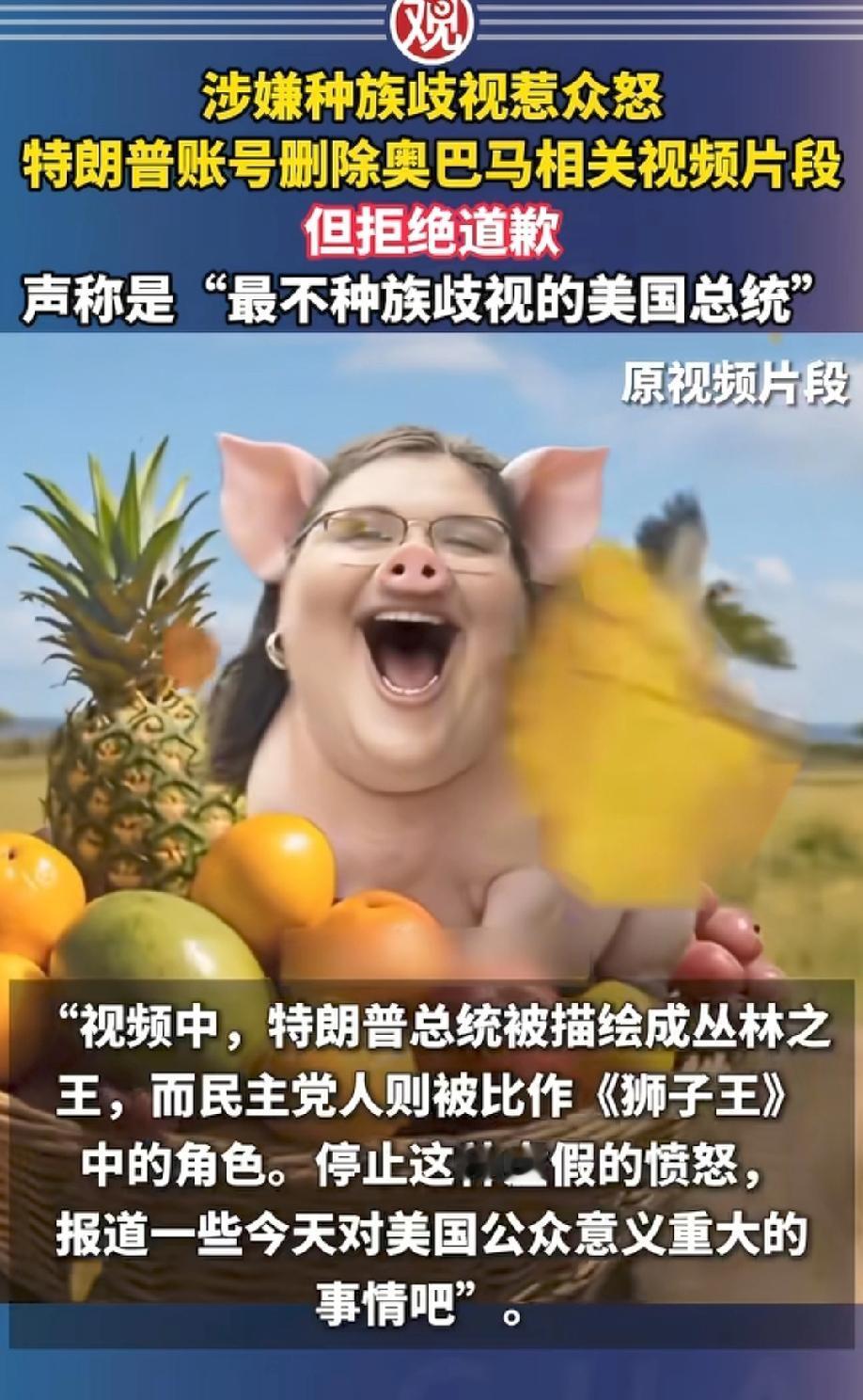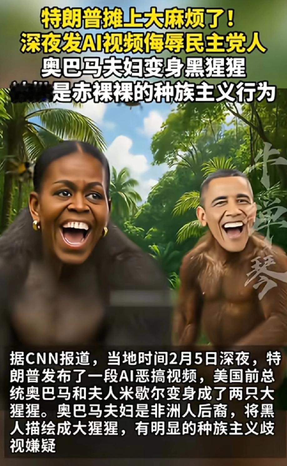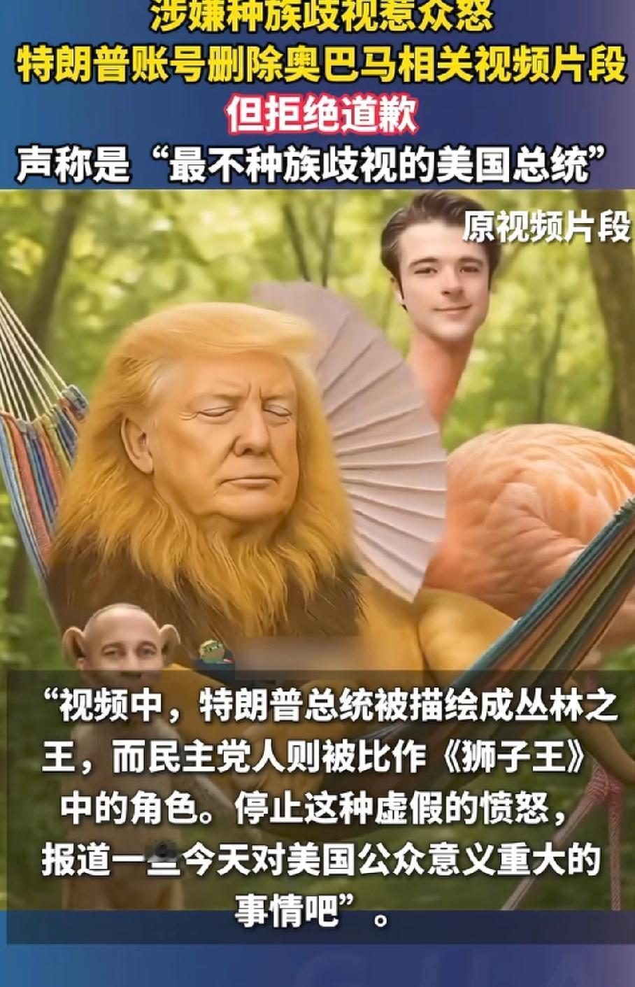 老特隔几天就会给大家一个惊喜。日子过得是有声有色,吃不完的瓜! 这段狮子王配乐的AI视频中,奥巴马夫妇被P成了一对猴子,特朗普则是草原的狮子王,配着特朗普一头金色的头发倒是也没有任何违和之感,老拜登就惨了。那么大的年纪被做成红鼻子狒狒,死对头希拉里女士直接化身野猪女士! 在这个短视频中,老特化身独一无二的主角——狮子王,不仅接受动物的供奉,还接受这些民主党人的臣服! 不得不说一切看起来都挺好的,就爱看特朗普做事,总觉着他的出现不光是给其他国家找麻烦,他是给包括他自己以内的所有人找麻烦! 一段视频直接将整个民主党的大佬嘲讽了一个遍,老特这是真的不打算给自己留后路了! 可以预见的是,特朗普在任期内一定会拼命打压甚至要消灭民主党的,他之所以要当草原之王,就是要把美国的两党制变成一党专政,否则,老特下台后,得罪了那么多的人,民主党的清算足以要了他的命,也会坑了他的家族!
