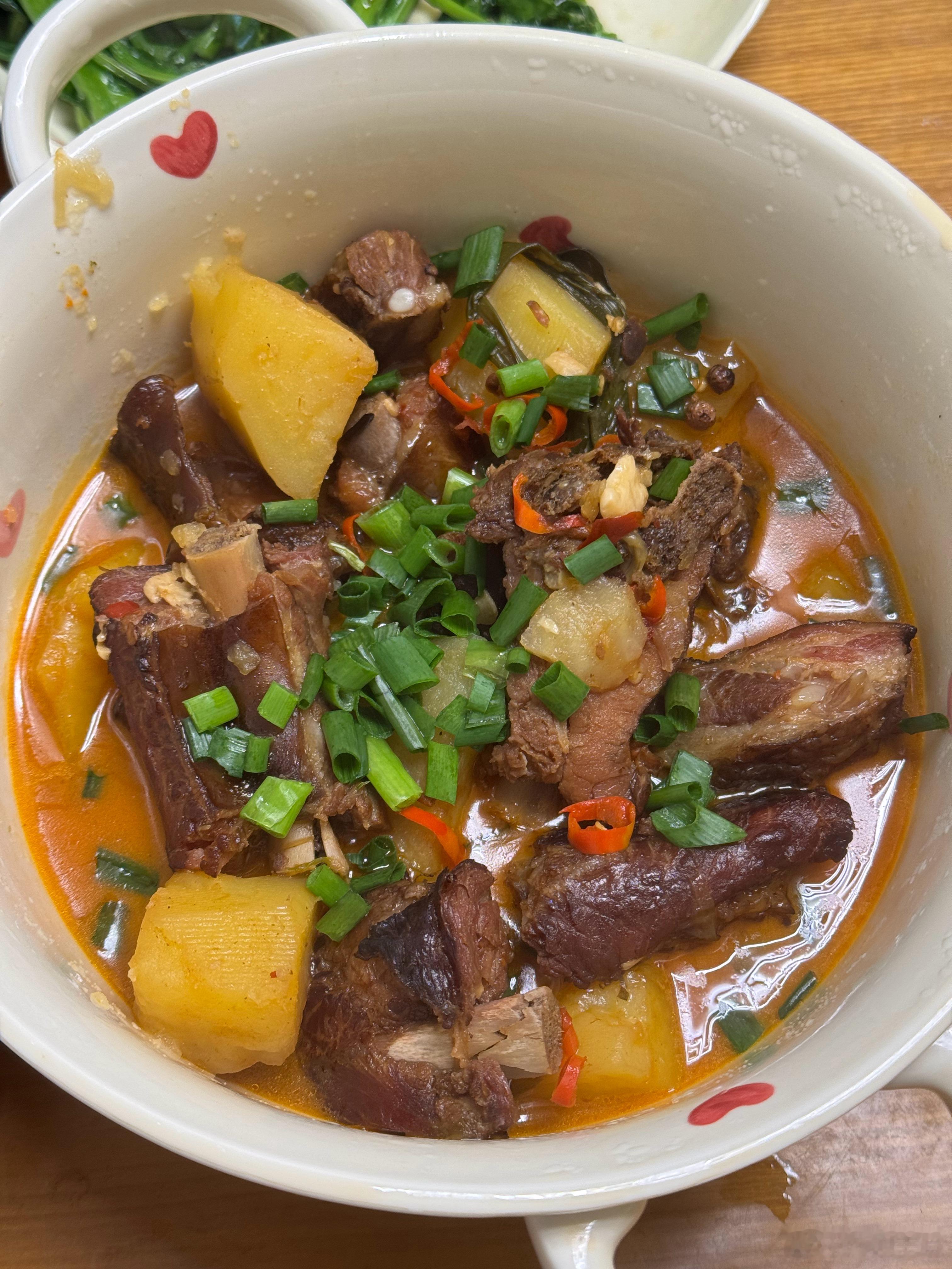 今天的晚餐是腊味宴!排骨香肠和广味香肠、辣椒炒麻辣香肠、腊排骨炖土豆,虽然都是烟熏腊味,但是吃起来各有特色。川川逛吃日常