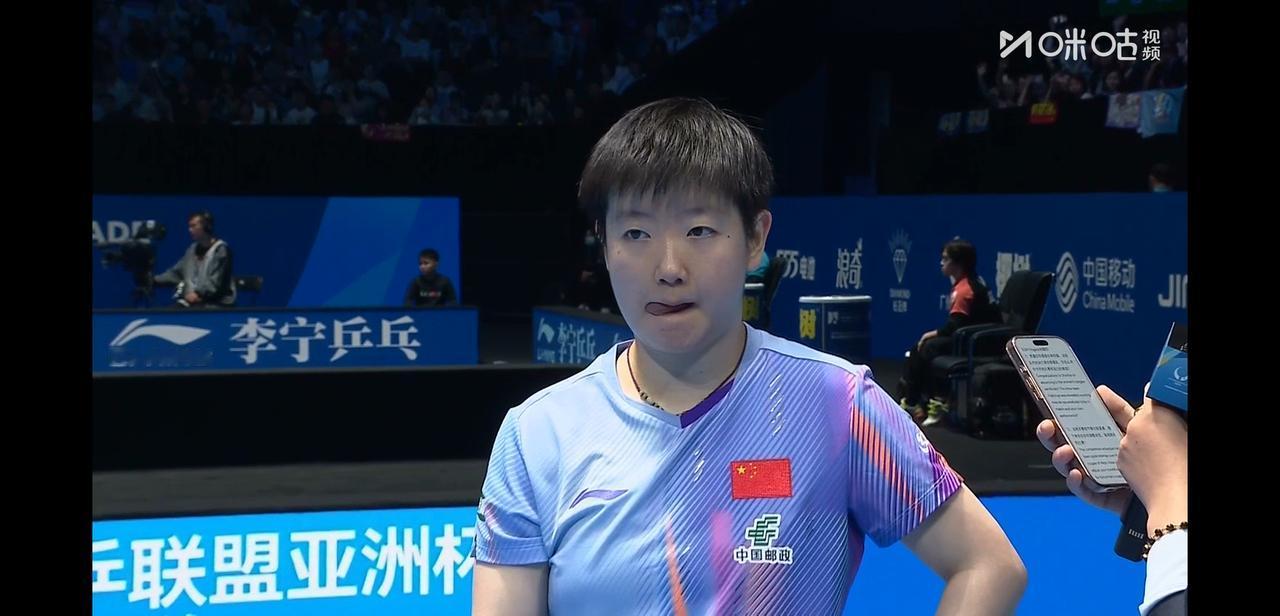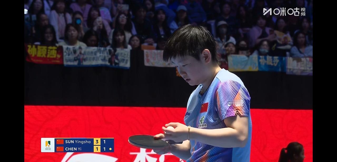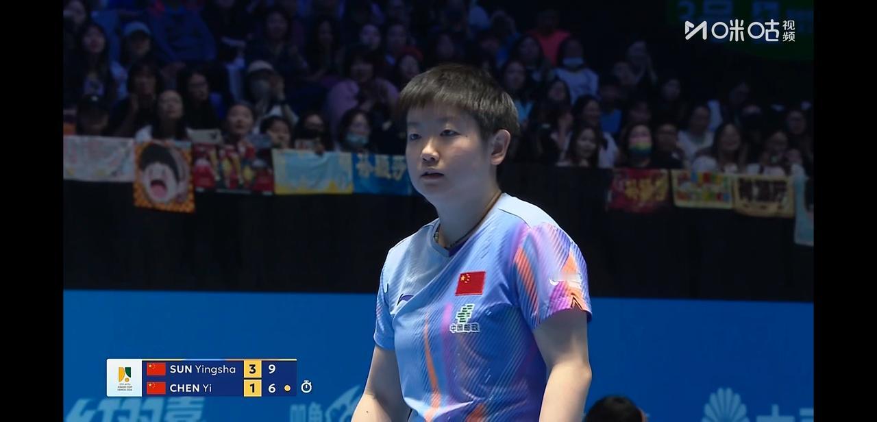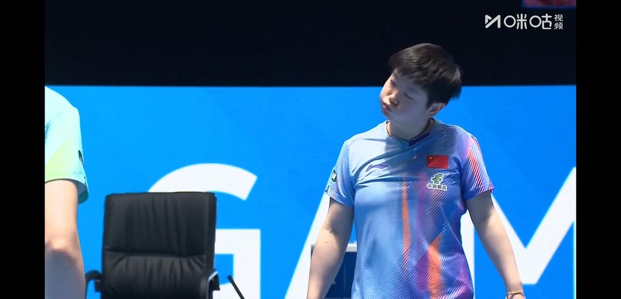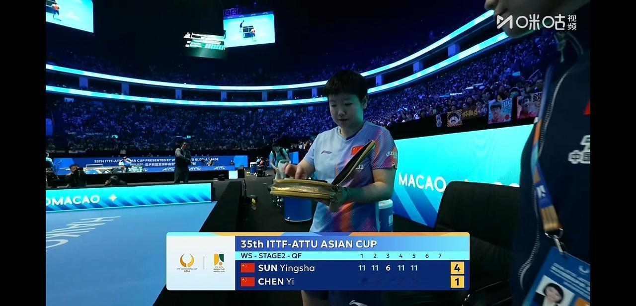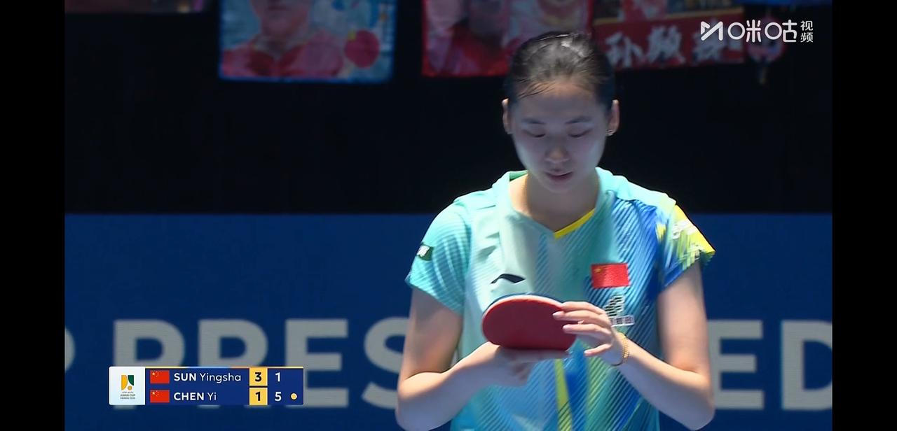 亚洲杯女单1/4决赛, 孙颖莎与陈熠。 在第五局一开局孙颖莎先拿到一分, 接着陈熠连续拿到了五分, 在被孙颖莎连续追分到4:5时陈熠要了暂停, 陈熠的勾手发球还是起到一定作用, 比分一度来到6:6, 但无论是第五局还是全场看下来, 孙颖莎都非常果断。 大比分4:1恭喜孙颖莎晋级女单四强。 图一图二抓到了莎莎噘嘴的瞬间, 太可爱了, 丟了一个球, 小嘴撅起来,哈哈。