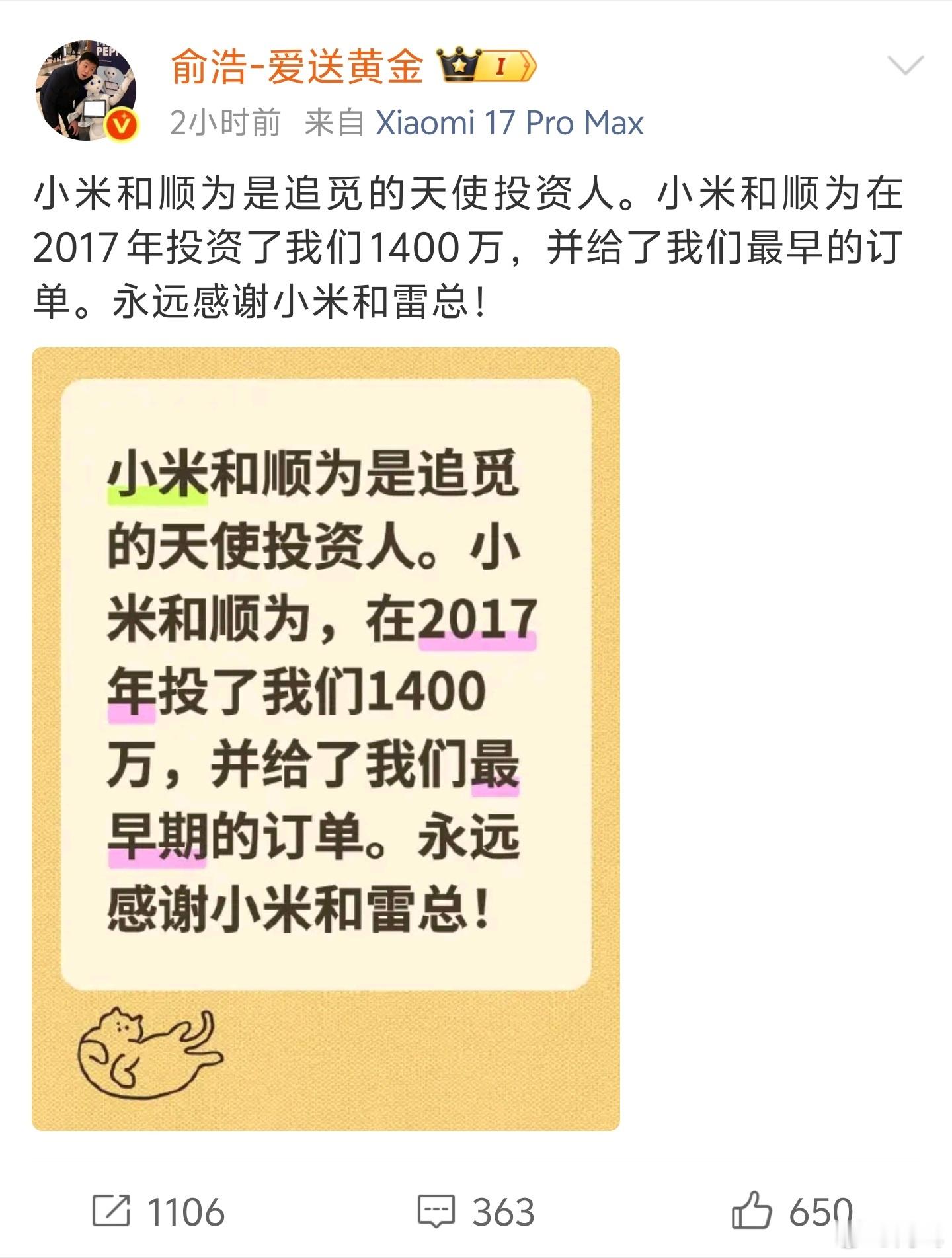 追觅俞浩发博,表示小米和顺为是追觅的天使投资人,永远感谢小米和雷总。