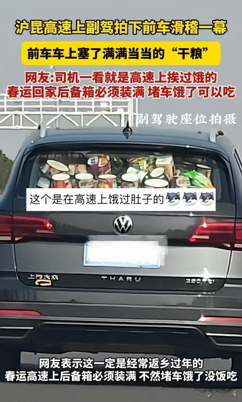 沪昆高速拍下了滑稽一幕, 一辆车的后面装满了零食, 有泡面,瓜子,花生,还有八宝粥, 候车女司机看到开心坏了, 直接拍下了这有趣的一幕, 一看这位大哥就是经历过春运高峰的, 现在都有经验了, 有了这些干粮, 就算在上面读个几天几夜也没有事儿, 毕竟粮草充足。 经历过高速堵车的人都知道, 那才叫叫天天不灵,叫地地不灵, 如果没有买大量的零食, 那可真的要挨饿了, 现在的春运高速也是非常拥堵, 希望今年的高速会好一些, 毕竟谁也不想在路上堵着… 本来就放了几天的假, 结果全在路上耽搁了! 大家觉得这位大哥是不是有先见之明? 春运 沪昆高速铁路 沪昆通道