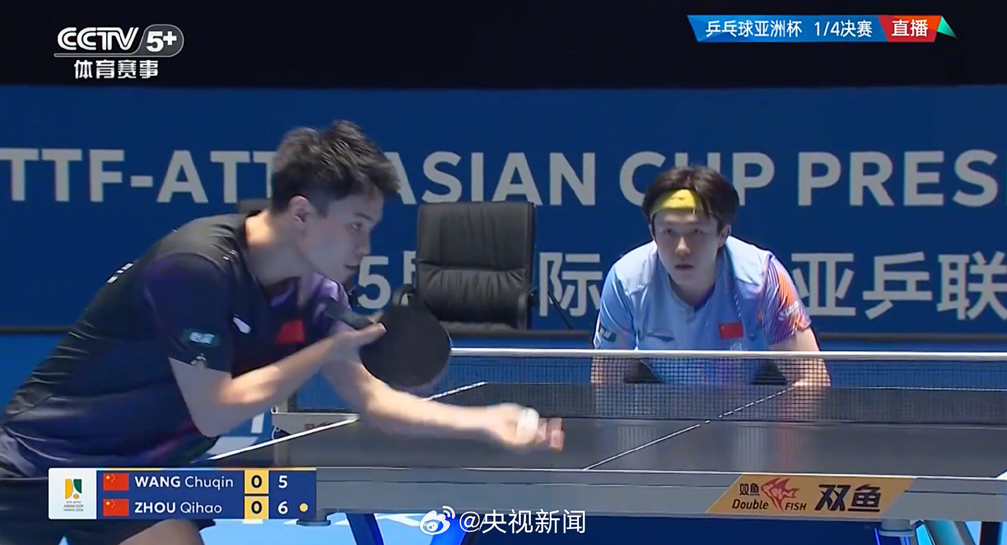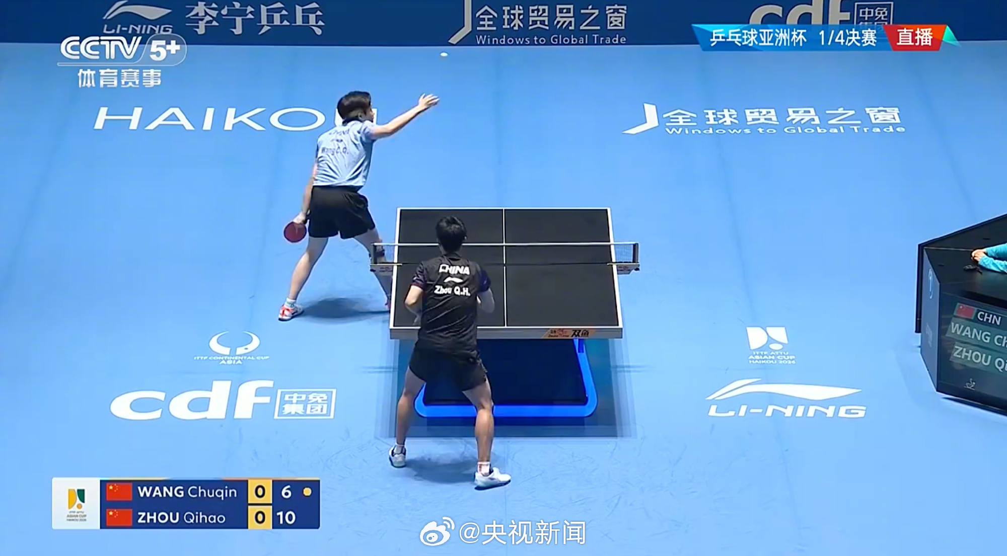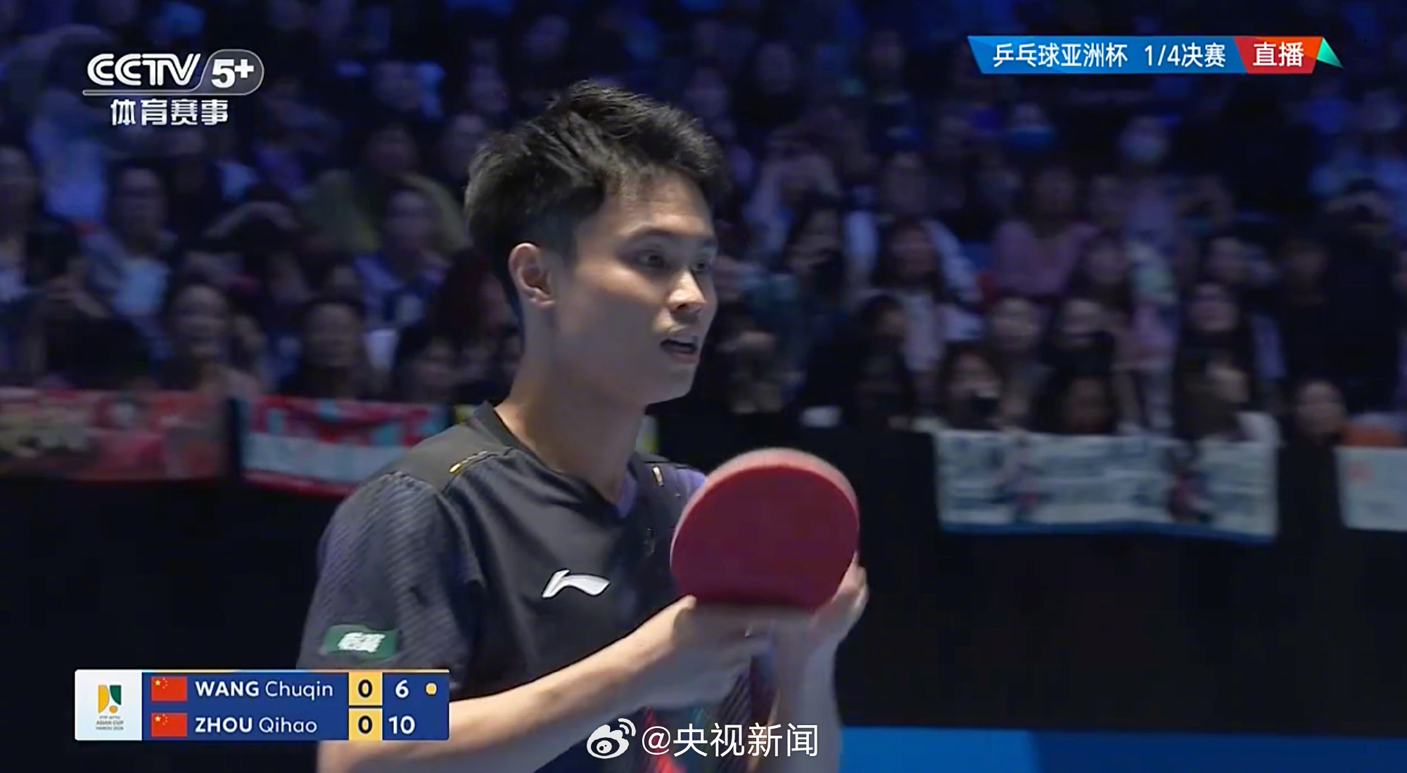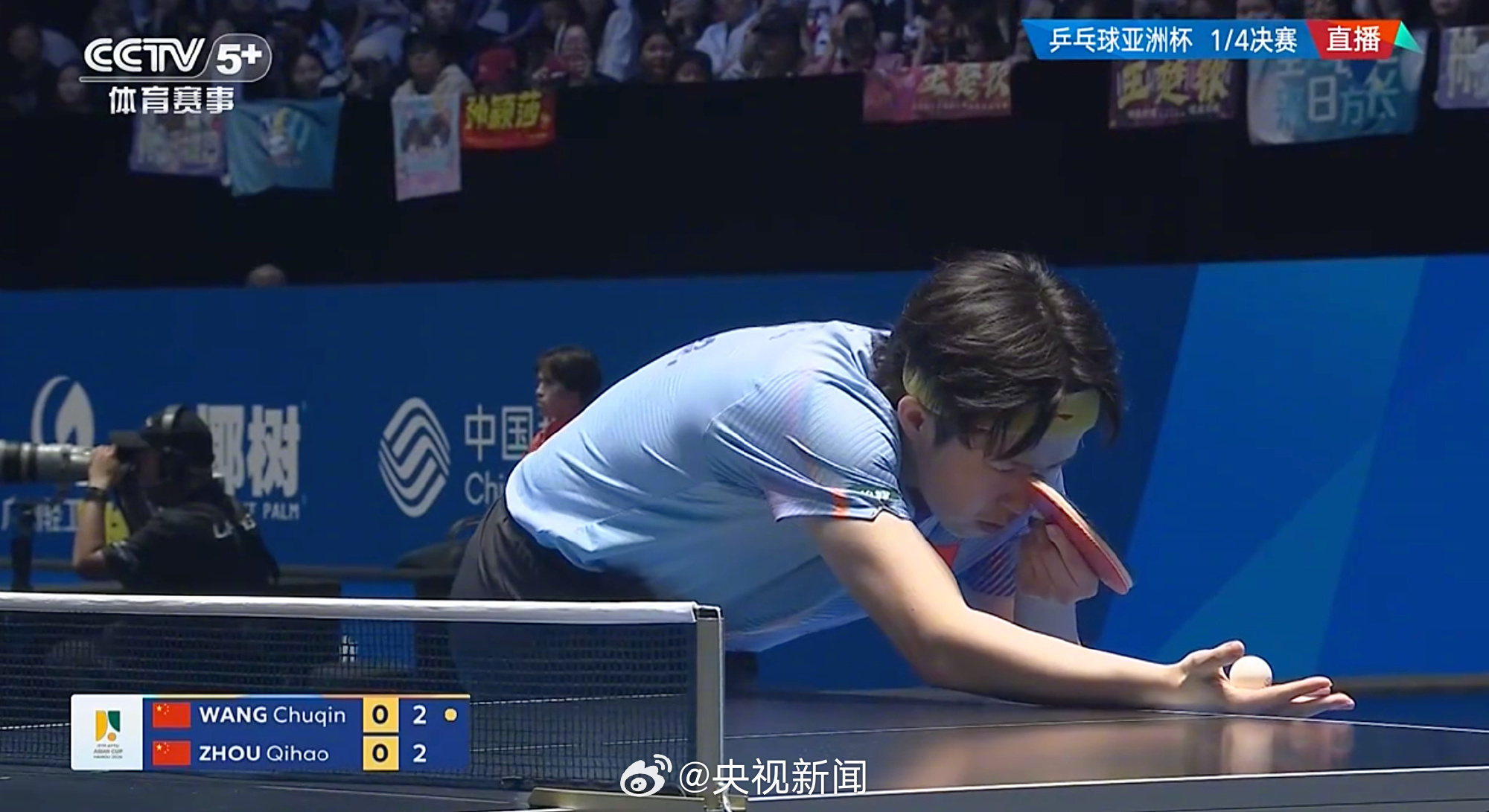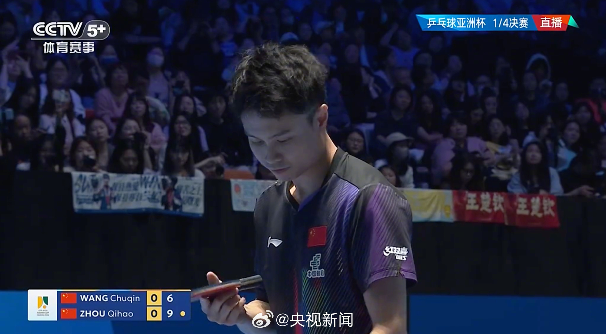 【#王楚钦男单4强#】第35届国际乒联-亚乒联盟亚洲杯男单1/4决赛,战胜周启豪,晋级四强。加油! (央视新闻)