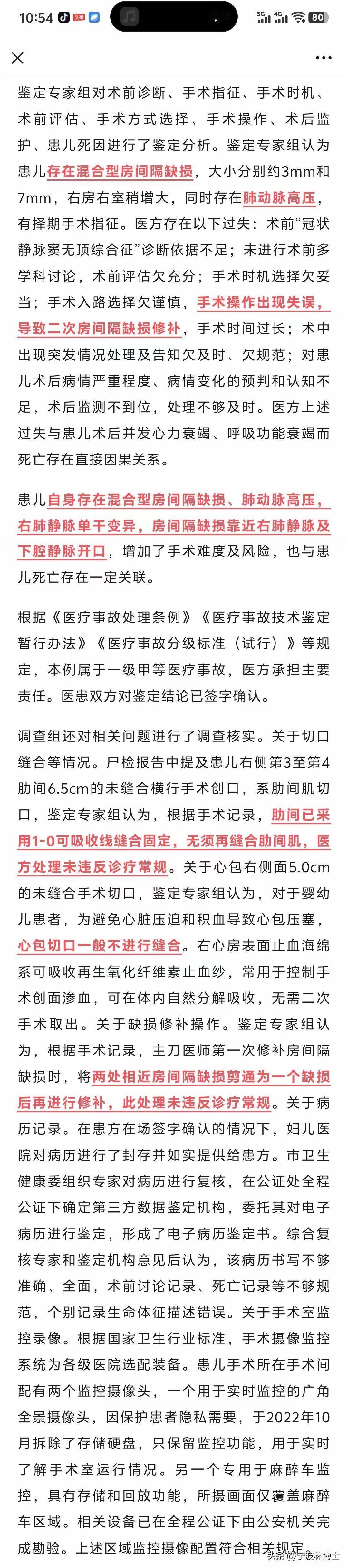 宁波附儿事件调查结论终于落地,看完通报我越想越觉得,这事儿根本不是非黑即白的站队,而是医疗责任、舆论边界、社会公平三件事必须掰扯清楚的大问题! 先把核心事实说透,调查组结论摆在这里,不是谁想改就能改的。孩子本身有混合型房缺、肺动脉高压,还有血管变异,根本不是家属说的“完全健康”,手术有明确择期指征,不存在“被骗开刀”。 术中用的可降解止血棉,本身就不用取出,符合规范;伤口处理也按流程来,那些“没缝伤口、故意害孩子”的说法,全是不符合医学常识的不实言论。 但医生真的没责任吗?绝对不是。术前没做多学科论证,评估太草率,手术时机选得不稳妥。 明明是高风险的复杂心脏问题,偏偏选了微创入路,想减少创伤却忽略了成功率,操作失误导致二次修补,手术时间拖得太长,这么小的宝宝根本扛不住。 这些硬伤,调查组写得明明白白,也是定一级甲等医疗事故、吊销医生执业证的核心依据。 这里必须厘清一个关键:吊销执业资格,不是顶格处罚,也能看出官方认定医生没有主观恶意,更多是专业判断失误、操作失当、过于自信。 两年后可以重新申请,但经历这一遭,能不能迈过心里那道坎,能不能再拿起手术刀,都是未知数。 现在警方已经立案,要查医生是否涉刑责,该追责绝不手软,这是对生命的敬畏,也是医疗行业必须守住的底线。 可问题来了,责任不能只追一方。家属失去孩子,心疼难过所有人都能理解,但用造谣、煽动舆论的方式施压,把不实信息传遍全网,给城市、给医院、给整个医疗群体造成恶劣影响,这就合理吗? 如果只罚医生犯错,不约束舆论造谣,那是不是在变相鼓励“闹大就有理”“编故事就能赢”? 合法维权是每个人的权利,我们绝对支持,但靠编造谎言、带节奏获得的关注与所谓“收益”,难道不该依法处理、该退的退、该罚的罚吗? 医疗、教育、养老,是压在很多人心里的三座大山,也是社会稳定的根基。 越是这样的领域,越容不得半点双标,越要一碗水端平。医生犯错要重罚,舆论造谣也要有约束,这才是真正的公平公正。 不能因为心疼家属,就无视事实;也不能因为追责医生,就放过扰乱公共秩序的行为。 理性维权、尊重专业、守住法律底线,这才是我们该引导的方向,而不是被情绪带着走,被谣言牵着鼻子。 这件事给所有人敲了警钟:医生要敬畏生命、谨慎行医,没十足把握别硬扛;普通人要守住底线,维权走正道,别用谎言伤害无辜;社会更要守住公平,不偏袒任何一方,不让老实人吃亏,不让造谣者得利。 最后想问问大家,你们觉得这件事里,医疗责任和舆论边界到底该怎么平衡?家属维权该守哪些底线,医生行医又该牢记哪些准则?评论区一起聊聊,理性探讨,不站队、不偏激。