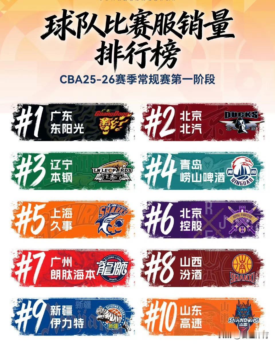 CBA第一阶段球队比赛服销量排行榜,广东队成功登顶!第四名出乎意料? 虽然广东队第一阶段的比赛,是一个高开低走的态势,甚至在最近都遭受到了连败,表现引起球迷不满。 但无论怎么样,广东球迷对于广东队的支持是不会变的,口头上可能会有所批评,但该支持的时候,还是会支持。 而且广东队内有徐杰、胡明轩这种高人气球员,排名登顶更是在意料之中。 不过,这第四名的球队,竟然是青岛队,确实是让人没想到。 杨瀚森都远走NBA了,队内的其他国内球员王睿泽、段昂君等人,也不算什么名气特别大的,为什么就能支撑青岛队排到第四呢? 要知道排在青岛队后面的,还有上海队、广州队、北控队、山西队等,像这几支球队内可是有郭艾伦、陈国豪、张镇麟、张宁、廖三宁等高人气球员,竟然都比不过青岛队吗?