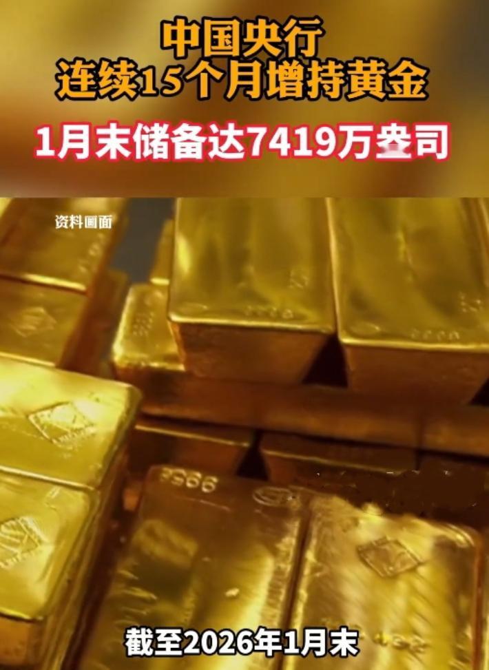 稳了!央行又“囤金”了!连续15个月增持,1月末黄金储备飙到7419万盎司,比上月又多了4万盎司,这操作看得人心里踏实。 别觉得这事儿离咱远——黄金就像家里的“压箱底钱”,国家囤得多,外汇储备就更稳,人民币底气也更足。打个比方,以前家里存钱可能单靠一种理财,现在多囤点黄金,就像给资产加了层“防护垫”,遇上风浪心里不慌。 从2024年11月至今,每月都增持,去年一年就多了86万盎司。这背后是国家对金融稳定的考量,就像咱过日子,手里有粮才敢踏实往前奔。对普通人来说,这信号也明明白白:经济根基稳,咱钱包里的钱才更靠谱。 你觉得家里该备点黄金吗?对这波“囤金潮”有啥看法?评论区聊聊,觉得这消息让人安心的,别忘了点赞转发,让更多人知道这份“稳稳的幸福”~
