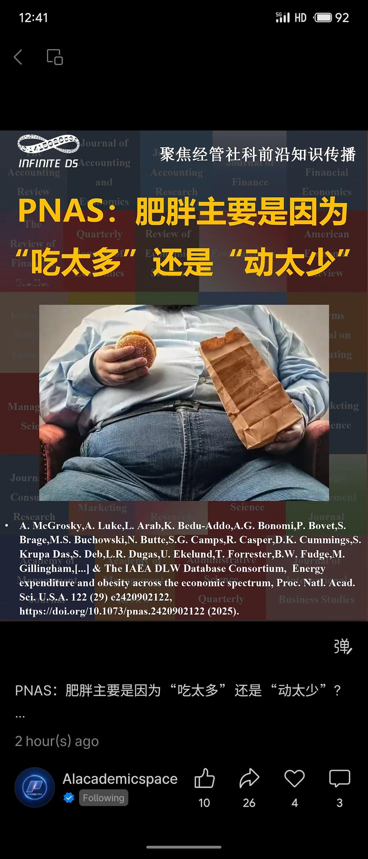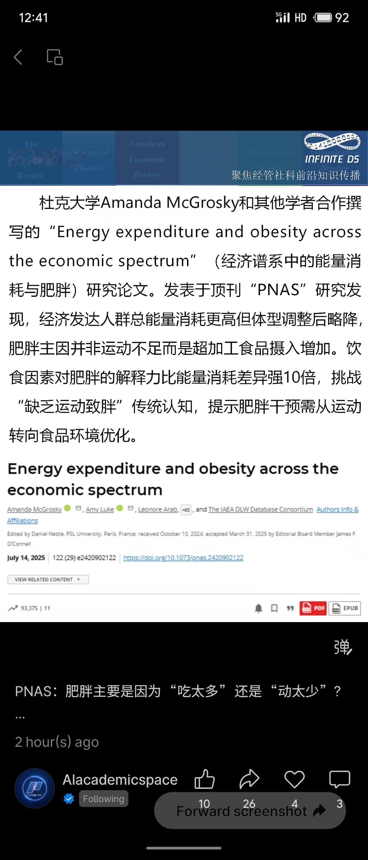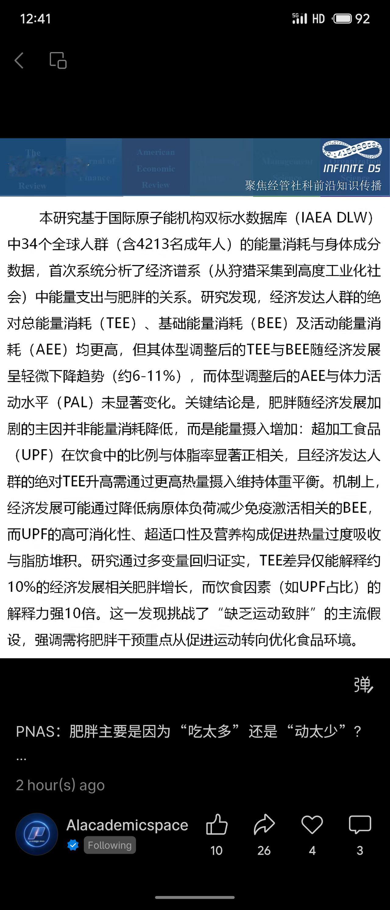 该PNAS研究基于全球34个人群数据分析发现,经济发展虽使人群总能量消耗略增,但肥胖主因并非运动不足,而是超加工食品摄入增加。饮食因素对肥胖的解释力比能量消耗差异强十倍,挑战了“缺乏运动致胖”的传统观点,提示公共健康干预应更注重优化食品环境而非单纯提倡运动。