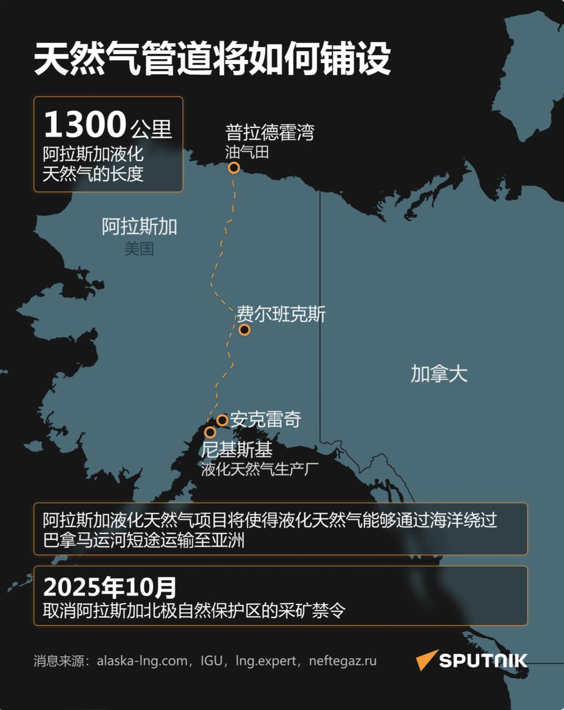 在阿拉斯加建造天然气管道 2026年2月7日, 02:01 (更新: 2026年2月7日, 06:38) 日本为向亚洲国家进口美国能源,投资建造阿拉斯加液化天然气管道。阿拉斯加液化天然气项目将使液化天然气无需经过巴拿马运河,以更短航程运抵亚洲。欲知详情,请浏览卫星通讯社视频图解。 去年3月,特朗普曾表示,美国的合作伙伴——包括韩国和日本——计划投资数万亿美元建设阿拉斯加输气管道。 今年2月,日本首相石破茂称,该国对美国能源的稳定供应感兴趣。他特别提到,阿拉斯加正在开发一个新气田。为了使日本能够获得天然气,需要建设一条输气管道,这将有助于其从邻近地区获得稳定的供应。