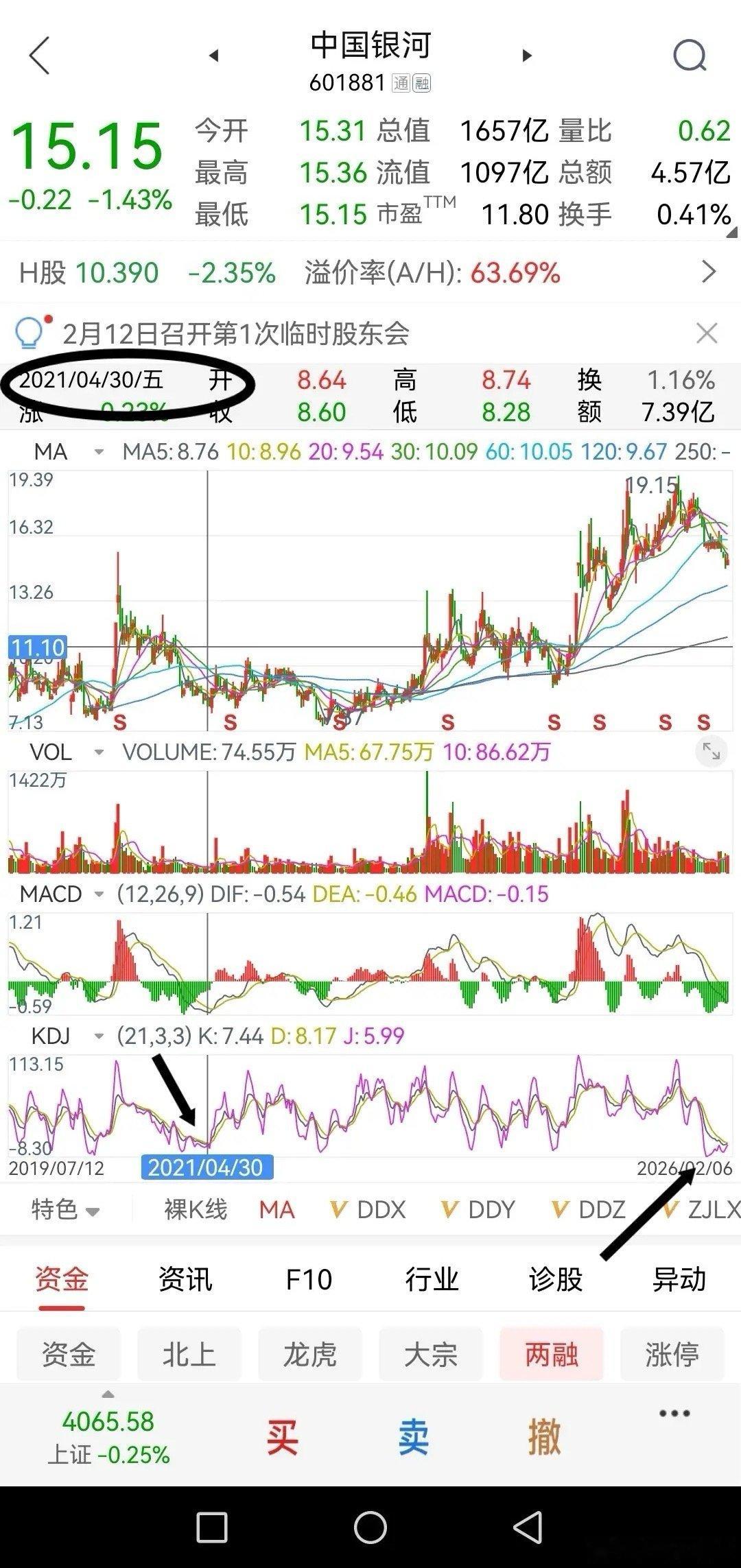 中国银河的周K线KD值来到四年多的低位。