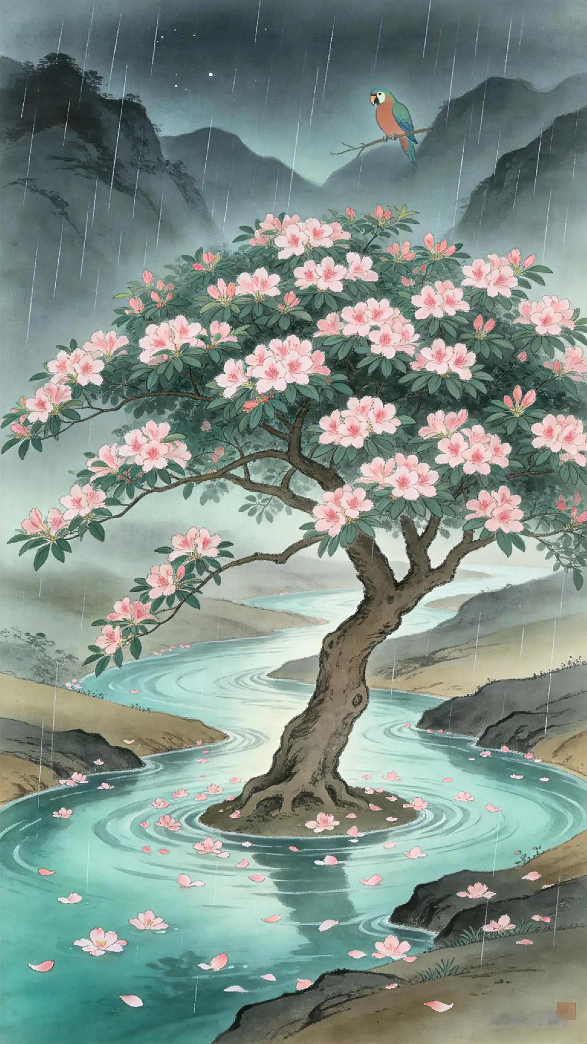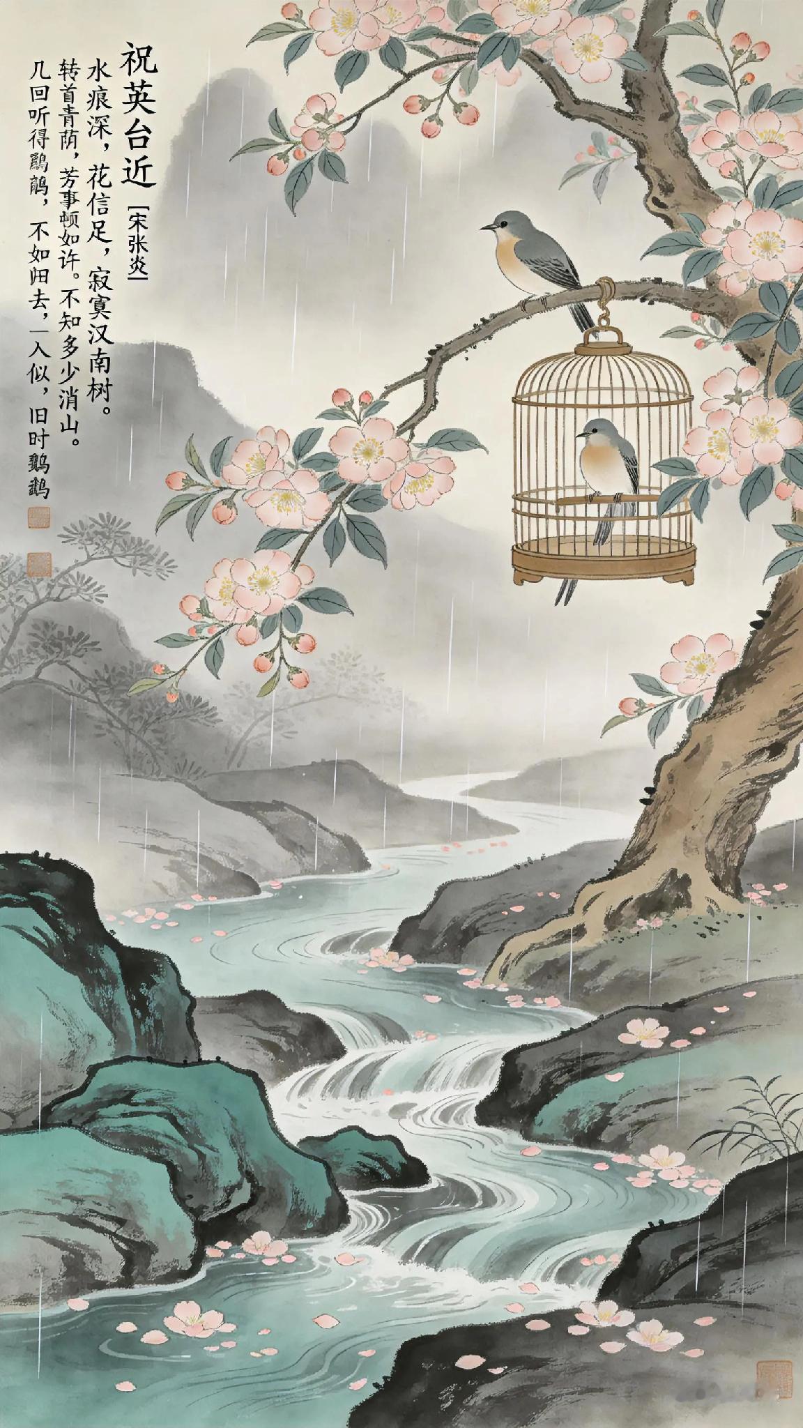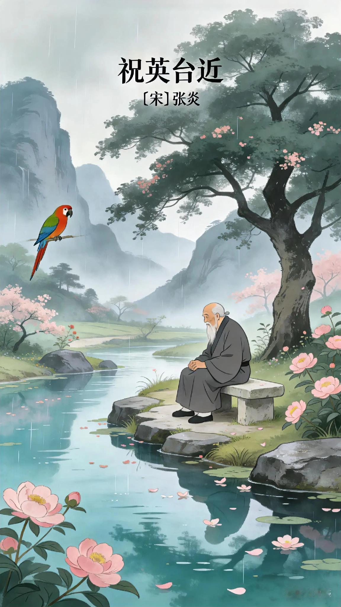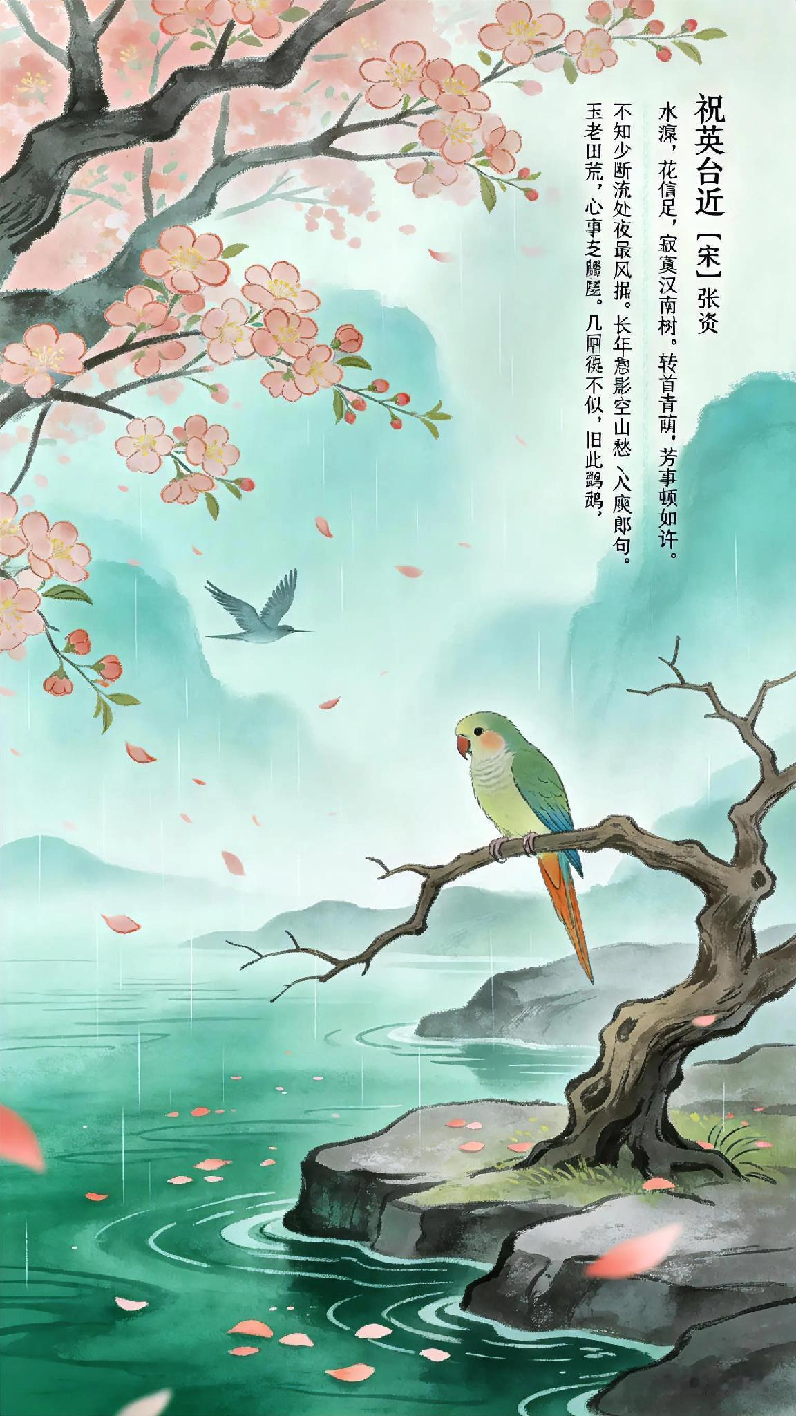 《祝英台近》宋、张炎。 水痕深, 花信足, 寂寞汉南树。 转首青荫, 芳事顿如许。 不知多少消魂, 夜来风雨。 犹梦到、 断红流处。 最无据。 长年息影空山, 愁入庾郎句。 玉老田荒, 心事已迟暮。 几回听得啼鹃, 不如归去。 终不似、 旧时鹦鹉。 《祝英台近》现译: 江水漫涨春花盛,汉南古树独寂寥。 转眼绿荫浓,芳华竟已凋。 夜来风雨骤,多少残红逐波流,魂梦亦追随。 最是飘零无依处,长年隐空山,愁绪浸透词句间。 美玉蒙尘田园芜,心事如暮色苍茫。 杜鹃声声催"归去",终难觅,当年那只会说人言的旧鹦鹉。 古典爱情词 几别宋词 近体格律七绝 近的诗句 近体诗格律诗 天天古诗词