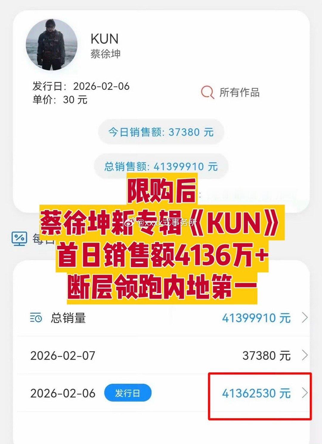 限购后 蔡徐坤新专辑《KUN》首日销售额4136万+,断层领跑内地TOP1,真金