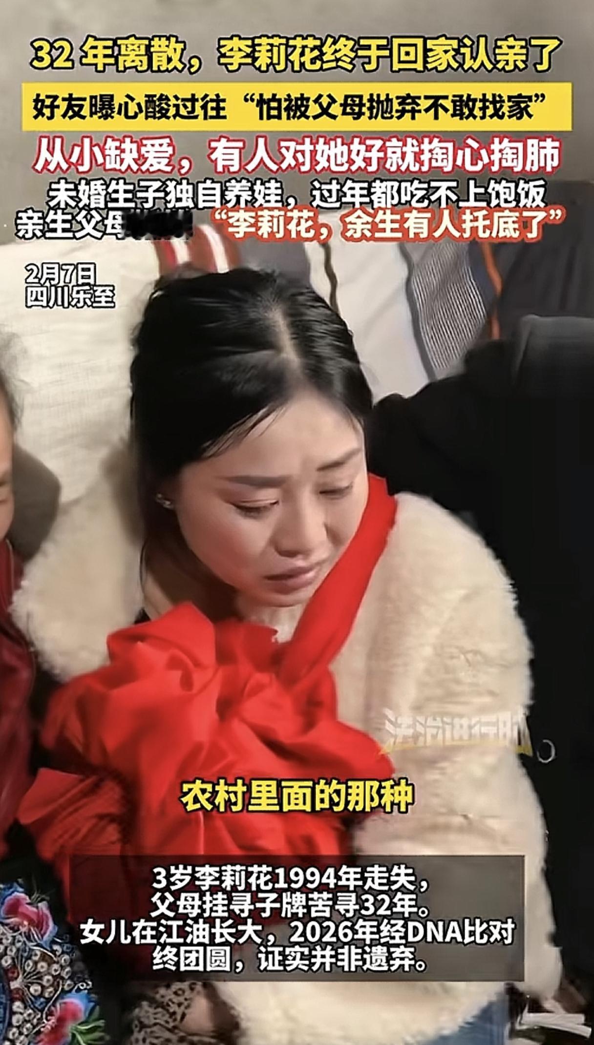 走丢32年的李莉花终于回家了!好友曝她心酸过往,说李莉花一直不敢找自己的亲身父母,怕自己是被抛弃的孩子,有个男的对李莉花好一点,李莉花还没领证,就生了个孩子,就想有个人能对她好一点。 李莉花在三岁时和母亲卖菜走丢,后被养父收养,养父平时对她不怎么照顾,小时候有时候连饭都吃不饱,15岁就辍学工作了。 后来李莉花生了孩子,也是自己一个人抚养长大,现在已经离婚。 即使和十几年的朋友在一起,李莉花说话也十分小心,生怕把朋友得罪了,特别怕别人离开自己。 更令人唏嘘的是,李莉花14岁时所在的学校,离亲生父母家仅仅相隔一公里,但一公里,听着很近,对于她来说却远在天涯! 李莉花说她特别想过一次真正的生日,过去的30多年里,她连自己的真实身份都不知道,身份证上也是随便填的。 李莉花从小在养父家无依无靠,被送来送去,生活的也很艰难,这养成了她内向自卑的性格。 三岁小女孩,那时候应该漂亮又可爱,被捡走后,把她送来送去,捡到小孩不应该报警吗?那第一个捡到她的家庭,把她一的生命运都改变了,应该追究他们的责任! 好在李莉花终于找到了自己的亲人,愿接下来的每天都是幸福甜蜜的!