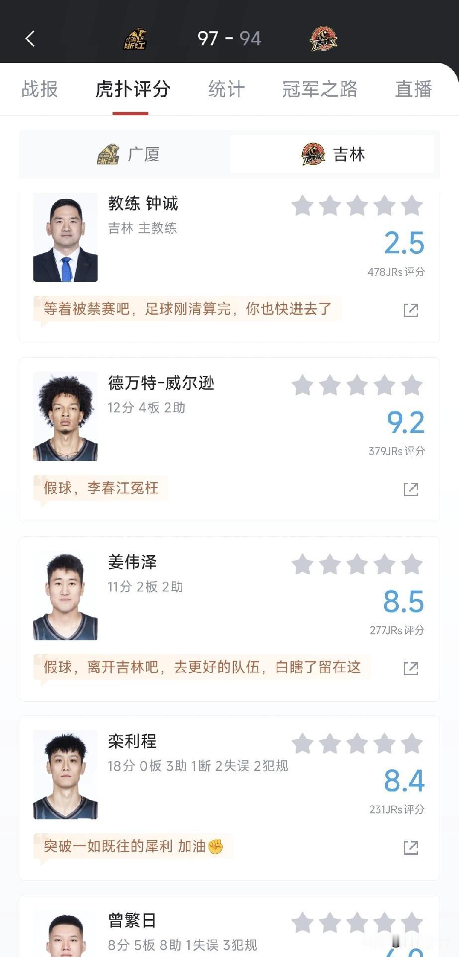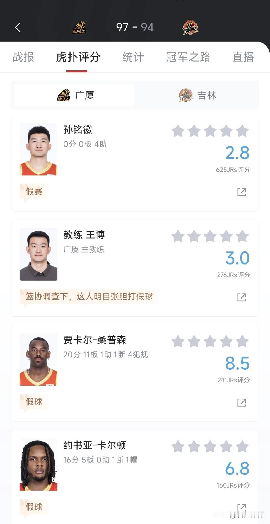 CBA再现假球? 在今天下午都俱乐部杯淘汰赛中,浙江广厦以97-94的比分,成功战胜吉林队,晋级到了下一轮。 可没想到,在赛后的评论区中,各个球员的评分之下,几乎清一色的球迷评论说假球。 我觉得不至于吧,CBA上次假球风波才过去了没多久,都忘了李春江、李楠遭到了什么样的处罚? 看了一下评论和视频,好像吉林队这边,打到最后的第三四节,明明有机会赢,却没有上状态出色的姜伟泽和威尔逊,以替补迎战,所以导致输给了广厦。 有没有观看了完整比赛的球迷朋友出来说一下,这是真的吗?