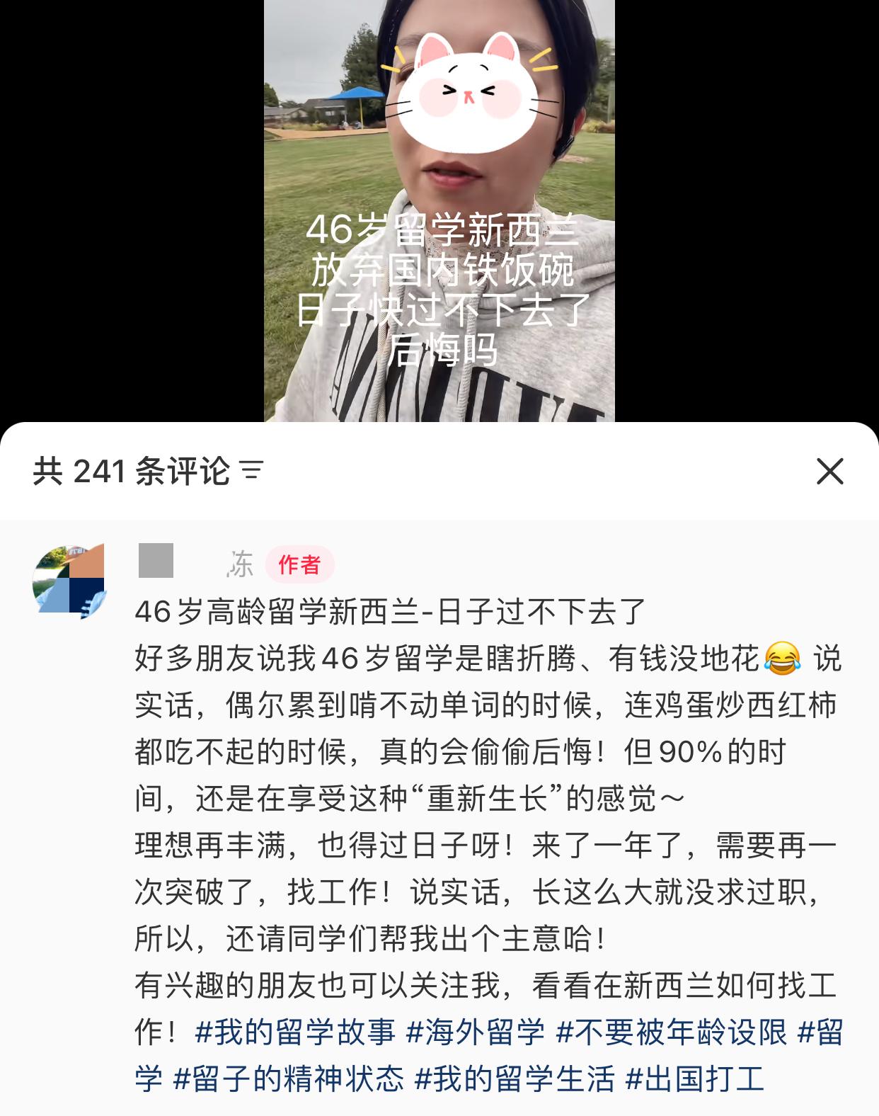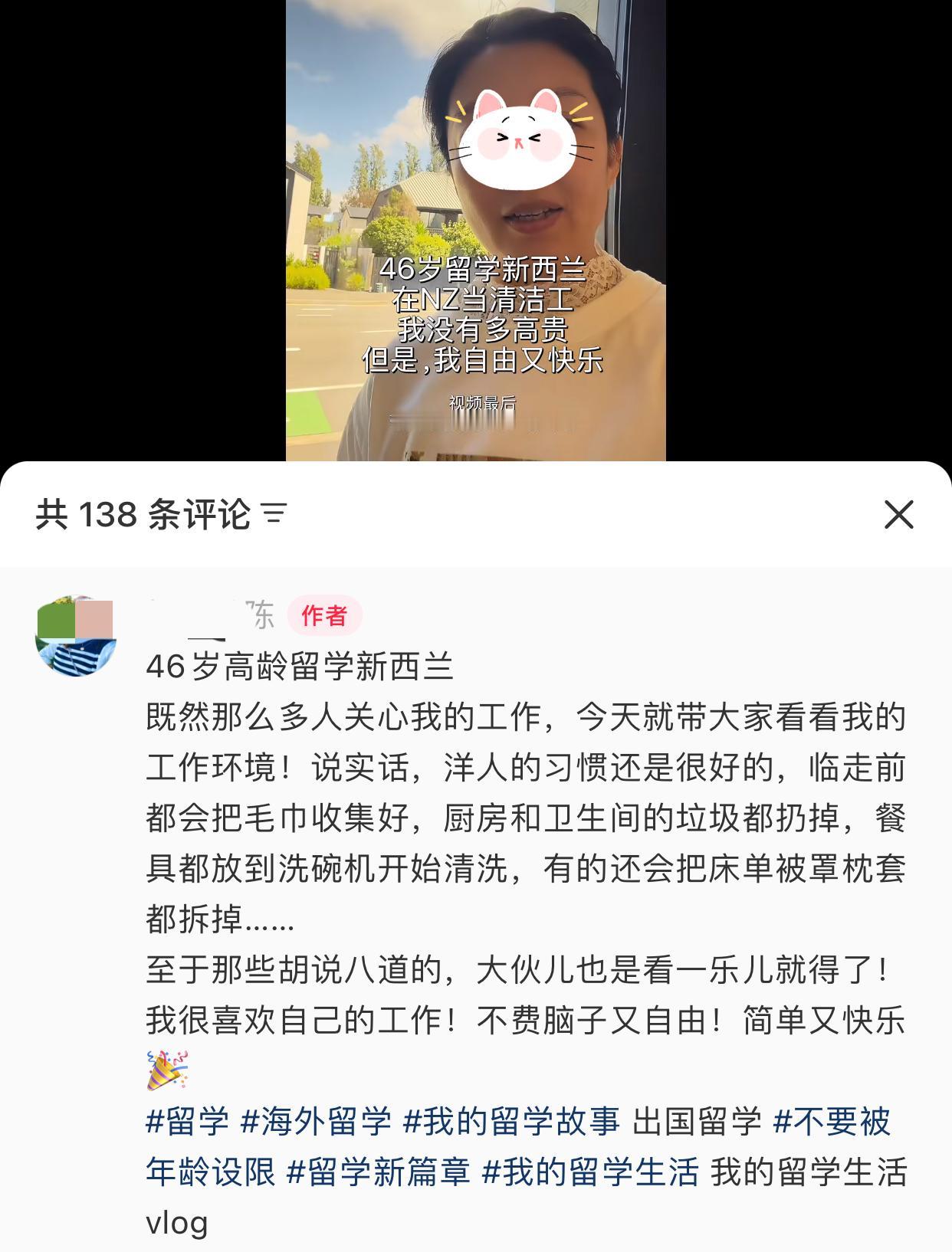 挺好的,自己开心就好… 原先在北京当老师的一位46岁大姐,她辞掉了国内的工作,一心的跑去新西兰留学,身边的朋友怎么劝也劝不住,现在她一边留学,一边做着清洁工,近日她发视频说这么做到底值不值… 她自己是觉得值得的,虽然偶尔会后悔,但多数时候还是享受这种重新生长的感觉…. 但其实当她说到值不值这个问题的时候,自己心里其实已经有答案了,只是不想承认而已,因为这不是一个游戏,是不能选择重来的,自己选择的路,现在咬着牙也得干下去! 不过也挺好的,在国外腰不酸腿不疼、人也通情达理不抱怨了、也能吃苦耐劳,果然还是西药好用呢!