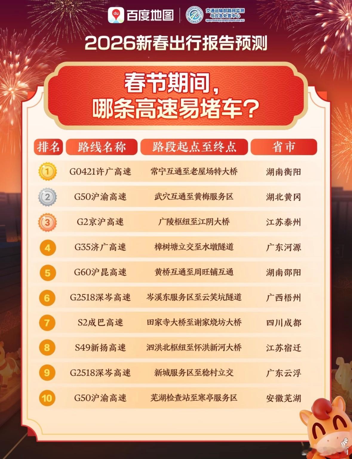 百度地图发布了2026年春节预测出行报告,哪些高速路段容易堵车,哪些收费站排队时间长……所以我选择在家躺着,不开车上高速了