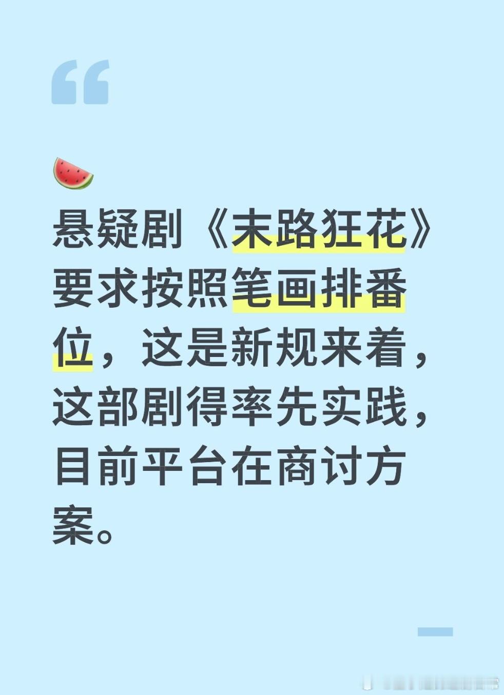 🍉娱乐冲浪悬疑剧《末路狂花》要求按照笔画排番位,这是新规来着,这部剧得率先实践,目前平台在商讨方案。